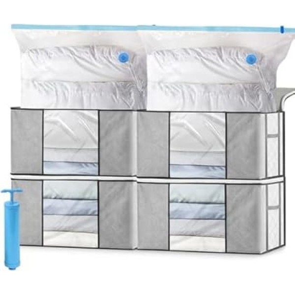 Complete storage set: this storage clothing set consists of 4 storage bags (60 x 40 x 35 cm) and 4 large-volume vacuum bags for duvets (110 x 80 cm and 80 x 60 cm) and 1 pump. Space-saving: This storage box and vacuum bag for clothes is designed to effectively organise and protect your clothes, duvets and pillows. Thanks to vacuum bag vacuum extraction, you save up to 80% storage space in your cupboards. This vacuum bag storage bag set is the practical and efficient storage solution for an orderly home and optimised space. Quality and durability: our vacuum bags and storage boxes are made of high-quality materials to ensure exceptional strength and durability. Vacuum bags for clothes form a hermetic barrier against dust, moisture, pests or other dirt. The sturdy zippers and reinforced handles of the storage bag allow for worry-free daily use. Fine craftsmanship: the storage box with lid has a transparent, transparent PVC window that helps you find your items at a glance. The storage bag is also equipped with high-quality, smooth two-way stainless steel zippers, which ensures a long service life. Besides, the wide handles of the storage box are double stitched with thick fabric, sturdy enough, and reliable for long-term use. Intelligent space use: the storage clothing set is perfect for versatile use, whether for moving, travelling or just for organising and protecting your things at home. This storage bag for clothes and duvets maximise wardrobe space and can be folded up to save space when not in use. › See more product details
