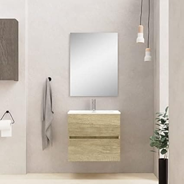 Assembled Furniture Made in Spain. Bathroom cabinet consisting of: wall cabinet with ceramic sink. Natural finish The dimensions of the bathroom furniture are 60cm (L) x 55cm (H) x 46cm (D) Basin measures 61cm (L) x 46cm (D) The division of the furniture consists of 2 drawers, locking system with damping for silent closing, wooden box textile finish, very clean. A piece of furniture with modern design, creates illusion, brings elegance and order to your bathroom. Natural furniture. The ONIX family has 5 designs and sizes of 50 cm, 60 cm, 70 cm, 80 cm, 90 cm and 100 cm. FSC certified, our commitment to society, certifies that the raw materials used have been extracted in sustainable forests that ensure the future survival of the forest and improve the quality of its flora and fauna. Assembled piece of furniture: the piece of furniture comes fully assembled, with assembly instructions (English language not guaranteed). English language not guaranteed). Not included: faucet, siphon, mirror. Suitable for installation with any standard faucet and siphon. › See more product details; Product description Main features: it consists of: ceramic cabinet and sink. 2 drawers with full extension and dampened locking system. Bathroom Dimensions: 60cm (L) x 55cm (H) x 46cm (D) Basin dimensions: basin measures 61 cm (L) x 46 cm (D). Composition: Made from melamine 16mm thick with concealed guide and wooden interior. High quality ceramic wash basin. Components: element and support for the placement of the bathroom set. Highlight: colour: natural sink included. EASY TO ASSEMBLE The furniture comes assembled, ready to assemble. Furniture weight: 30. Not included: faucet, drain valve and mirror. Package include:1 x Bathroom Cabinet 1 x Ceramic Worktop with Sink Environmentally friendly product.; Product description Main features: it consists of: ceramic cabinet and sink. 2 drawers with full extension and dampened locking system. Bathroom Dimensions: 60cm (L) x 55cm (H) x 46cm (D) Basin dimensions: basin measures 61 cm (L) x 46 cm (D). Composition: Made from melamine 16mm thick with concealed guide and wooden interior. High quality ceramic wash basin. Components: element and support for the placement of the bathroom set. Highlight: colour: natural sink included. EASY TO ASSEMBLE The furniture comes assembled, ready to assemble. Furniture weight: 30. Not included: faucet, drain valve and mirror. Package include:1 x Bathroom Cabinet 1 x Ceramic Worktop with Sink Environmentally friendly product.; Main features: it consists of: ceramic cabinet and sink. 2 drawers with full extension and dampened locking system. Bathroom Dimensions: 60cm (L) x 55cm (H) x 46cm (D) Basin dimensions: basin measures 61 cm (L) x 46 cm (D). Composition: Made from melamine 16mm thick with concealed guide and wooden interior. High quality ceramic wash basin. Components: element and support for the placement of the bathroom set. Highlight: colour: natural sink included. EASY TO ASSEMBLE The furniture comes assembled, ready to assemble. Furniture weight: 30. Not included: faucet, drain valve and mirror. Package include:1 x Bathroom Cabinet 1 x Ceramic Worktop with Sink Environmentally friendly product.
