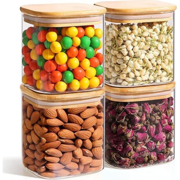 Safe and non-toxic: Our storage containers with lids airtight made of borosilicate glass are food-safe, lead-free and free from harmful substances. They impress with their robustness and durability. The natural bamboo lids give the storage jars a stylish, modern look. While the glass containers with lids are dishwasher safe, we recommend manual cleaning of the lids for optimal care. Versatile: Our 700 ml storage jars with lids are perfect for storing biscuits, snacks, nuts, tea and more. They are also great as candy containers, bath additive jars, spice jars or sugar and coffee containers. The glass storage jars seamlessly adapt to your different storage requirements. Airtight and fresh: the square storage jar has a bamboo lid with silicone seal, which ensures an airtight seal. This keeps your food fresh for longer and protected from moisture. Our glass containers with lids guarantee optimal protection for your supplies. Space-saving design: thanks to its square shape, our kitchen storage box with lid maximises space in your kitchen. They airtight storage containers with lids are stackable and allow efficient use of space. The 10 cm wide neck ensures easy handling, ideal for everyday use. Compact for on the go: with a handy size of 10 cm x 10 cm (H x W), our storage jars with lids are easy to transport. Perfect for picnics or travel to take snacks or spices. This glass storage jars with lid is ideal for on the go and during outdoor activities. › See more product details