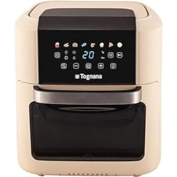 VINTAGE DESIGN: The 11L Iridea Hot Air Fryer and Oven is part of Tognana's extensive range of small kitchen appliances, available in several colours in a stylish, appealing retro look for a perfect, trendy, colourful vintage style. Multifunctional: the hot air fryer and oven are equipped with a digital display that offers 8 custom programs, a 60 minute timer, a drying function and an adjustable temperature from 80° to 200°. Capacity: with a capacity of 11 L, it is suitable for preparing food for up to 7-8 people and is ideal for cooking without adding oil. Safety: the hot air fryer and oven have overheating protection, a power interruption system when the basket is removed from the base, and non-slip feet. Cleaning: the cooking accessories are dishwasher safe; the body of the fryer can only be cleaned by hand with a soft, slightly moistened cloth. › See more product details; Product description With a modern colour digital display and 8 preset programs, the 11 L Champagne Iridea hot air fryer and oven is part of Tognana's extensive range of small household appliances, available in several colours in an attractive retro look. It offers a perfect, trendy and colourful vintage style that suits any kitchen. Ideal for cooking without oil up to 7-8 servings, the 11 L Iridea hot air fryer and oven allows you to be creative with a variety of recipes. Thanks to the glass door, you can monitor the cooking process at any time, and the 8 preset programs make preparation easy: chips, chicken, meat, seafood, cakes, pizza, vegetables and much more, with a healthy and tasty cooking method! Key features include a 60-minute timer, adjustable temperature from 80° to 200°, automatic shut-off and a signal when cooking is complete, overheating protection, a power interruption system when the basket is removed from the base, as well as preheating and defrosting functions and a dehydrating function - a perfect kitchen aid that combines technology and functionality with a unique, timeless design. ! The Iridea Champagne hot air fryer and oven is also available in Carta da Zucchero colour and in different capacities to meet all your needs. *The cooking accessories are dishwasher safe; the fryer housing can only be cleaned by hand with a soft, slightly damp cloth.; Product description With a modern colour digital display and 8 preset programs, the 11 L Champagne Iridea hot air fryer and oven is part of Tognana's extensive range of small household appliances, available in several colours in an attractive retro look. It offers a perfect, trendy and colourful vintage style that suits any kitchen. Ideal for cooking without oil up to 7-8 servings, the 11 L Iridea hot air fryer and oven allows you to be creative with a variety of recipes. Thanks to the glass door, you can monitor the cooking process at any time, and the 8 preset programs make preparation easy: chips, chicken, meat, seafood, cakes, pizza, vegetables and much more, with a healthy and tasty cooking method! Key features include a 60-minute timer, adjustable temperature from 80° to 200°, automatic shut-off and a signal when cooking is complete, overheating protection, a power interruption system when the basket is removed from the base, as well as preheating and defrosting functions and a dehydrating function - a perfect kitchen aid that combines technology and functionality with a unique, timeless design. ! The Iridea Champagne hot air fryer and oven is also available in Carta da Zucchero colour and in different capacities to meet all your needs. *The cooking accessories are dishwasher safe; the fryer housing can only be cleaned by hand with a soft, slightly damp cloth.; With a modern colour digital display and 8 preset programs, the 11 L Champagne Iridea hot air fryer and oven is part of Tognana's extensive range of small household appliances, available in several colours in an attractive retro look. It offers a perfect, trendy and colourful vintage style that suits any kitchen. Ideal for cooking without oil up to 7-8 servings, the 11 L Iridea hot air fryer and oven allows you to be creative with a variety of recipes. Thanks to the glass door, you can monitor the cooking process at any time, and the 8 preset programs make preparation easy: chips, chicken, meat, seafood, cakes, pizza, vegetables and much more, with a healthy and tasty cooking method! Key features include a 60-minute timer, adjustable temperature from 80° to 200°, automatic shut-off and a signal when cooking is complete, overheating protection, a power interruption system when the basket is removed from the base, as well as preheating and defrosting functions and a dehydrating function - a perfect kitchen aid that combines technology and functionality with a unique, timeless design. ! The Iridea Champagne hot air fryer and oven is also available in Carta da Zucchero colour and in different capacities to meet all your needs. *The cooking accessories are dishwasher safe; the fryer housing can only be cleaned by hand with a soft, slightly damp cloth.