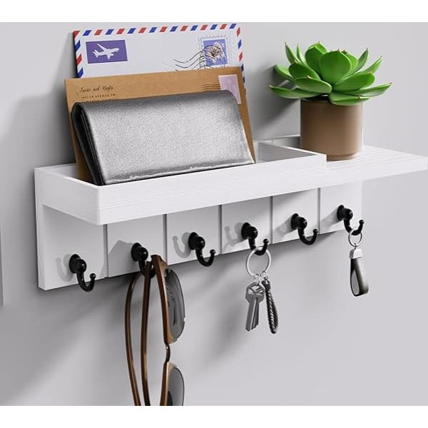 HapiRm Wooden Key Holder - Key Holder for the Wall, Key Hook Wall Mounted with 6 Hooks, Key Holder with Shelf for Letters, Telephone and Decorations for Hallway, Office - White 32 x 9 x 9 cm