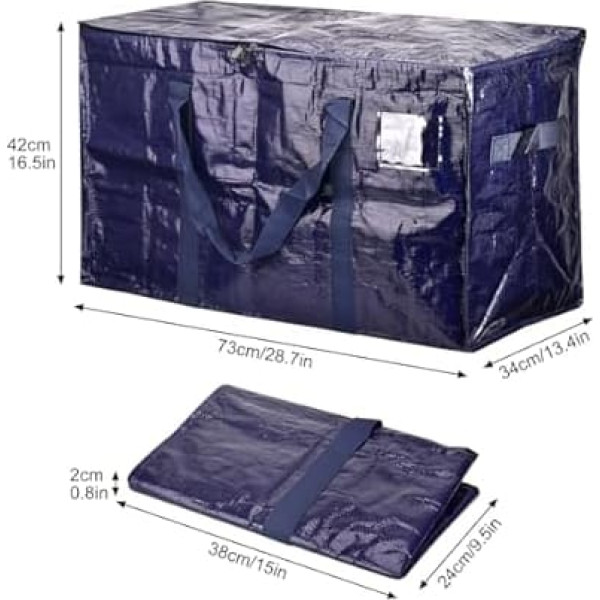 Material The storage bag is made of woven coated polypropylene material. The tear-resistant handles with reinforced stitching can safely hold up to 50 lbs. This heavy duty storage bag is waterproof, UV resistant to ensure you can use it multiple times. It is the perfect storage bag for you. Size: 73 x 42 x 34 cm and holds up to 90 litres. Provides ample space to store and pack a variety of items, while effectively getting dust, dirt and pests into the storage bag. Large capacity can store everything you want. The storage bags have a high quality double zipper head, which is more convenient for you to open the storage bags. Take advantage of the versatility and use them to store clothes or underbed storage, and as laundry bags or storage bags for your bedding, blanket or Christmas tree. Package included:4 large storage bags When not in use, simply use a disinfectant wipe or damp cloth to clean both the interior and exterior and then air dry. Wide Application Multiple moving bags can be stacked after being packed into corresponding items for easy storage in closets or when traveling or moving. Multipurpose storage bag for all your dirty laundry, seasonal clothes and camping, moving shopping. › See more product details; Product description 1 piece; Product description 1 piece; 1 piece