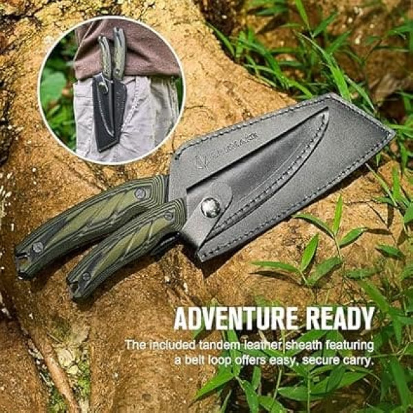 DURABLE & SHARP BLADE Matte black titanium coated 1.4116 steel blade with excellent texture that combines hardness, toughness and rust resistance. ERGONOMIC HANDLE Ergonomic curved design for a comfortable grip, non-slip, wear-resistant and durable, beautiful military green and black colors, easy to clean after use. MULTIPURPOSE The multi-purpose knife set is suitable for cutting vegetables, meat, fruit, fish fillets, boning meat, cutting soft bones and more. Equipped with portable holster, easy to carry when barbecuing, camping, hiking and other outdoor activities. DOUBLE BLADE HOLSTER The high quality holster protects the blades during storage and transportation and attaches easily to the belt so you can easily take it with you when camping or doing other outdoor activities. Unique Design The black blade and black and green handle with clip color highlight the sturdy and cool style. › See more product details
