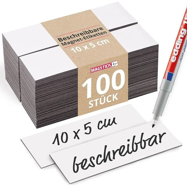 Large selection – discover our variety of magnets for your next project. Details: size: 100 x 50 mm, thickness: 0.85 mm, quantity: 100 pieces. With pen included Sustainable – Our writable magnets are an environmentally friendly and practical alternative to the usual disposable notes. The magnetic signs are durable and reusable, so you can easily reduce your paper consumption. With a whiteboard marker, you can write on the magnets and wipe them off again after use. These versatile magnetic strips are suitable for attaching notes as well as for direct labelling. So you actively contribute to a more sustainable lifestyle Easy to clean – discover our high-quality whiteboard magnets, which are characterised by their effortless and residue-free cleaning. With the special surface, you can easily write on the magnets with a non-permanent marker and easily wipe them with a damp cloth if necessary. So the magnetic signs are reusable at any time and always look like new. Convince yourself of the practical handling and versatility of our rewritable magnetic cards - ideal for everyday use Practical everyday aid – ideal for sorting and organising. The rewritable magnetic labels are versatile, be it in the office, home or school. They can be cut to size and are suitable for lightweight items such as notes and cards. Ideal for whiteboards, magnetic boards and refrigerators, but not suitable for glass magnetic boards. Their uses range from meetings to household planners to kanban and scrum cards. Expert customer service – Our Magstick team is at your side after purchase to ensure you are completely satisfied. If you have any questions or problems, please contact our German customer support. We are here to help you within 24 hours and guarantee you a great shopping experience. Trust Magstick - we are here for you! › See more product details