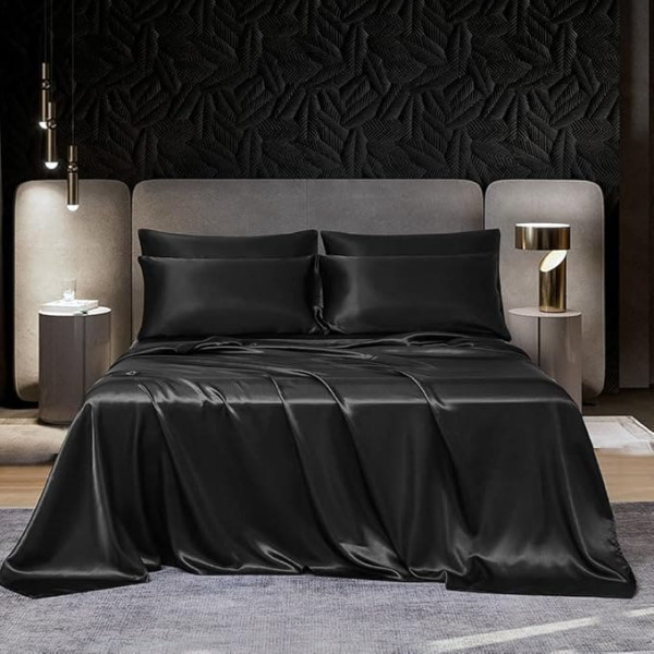 DuShow SATIN FITTED SHEETS DOUBLE SILKY SATIN 4 PIECE SHEET SET WITH 15" DEEP FITTED SHEETS 1 SOFT SHEET & 2 SATIN PILLOWCASES (BLACK DOUBLE