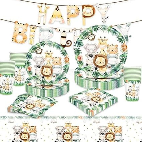 Birthday set for children: 25 plates (9 inches), 25 plates (7 inches), 25 napkins, 25 cups, 25 napkins, 1 tablecloth, 1 happy birthday banner. High quality: our jungle animals birthday children's tableware is made of high-quality paper material, safe and environmentally friendly, robust and durable, with clear print, are your perfect party items Jungle animal design: our birthday table sets have jungle animals theme, with paper plates with cute animals in bright colours and a unique and adorable design that adds atmosphere to your party. Save time: environmentally friendly materials do not need to be cleaned after the party, spend more time with your family Birthday party for children: Our tableware is very popular and is particularly suitable for children's birthdays, jungle animals, birthday gifts, class reunions, family reunions, outdoor events and more. › See more product details; Product description rave party tableware birthday jungle animals set birthday plates for newborn birthday animals napkins paper cups for party birthday baby animals; Product description rave party tableware birthday jungle animals set birthday plates for newborn birthday animals napkins paper cups for party birthday baby animals; rave party tableware birthday jungle animals set birthday plates for newborn birthday animals napkins paper cups for party birthday baby animals
