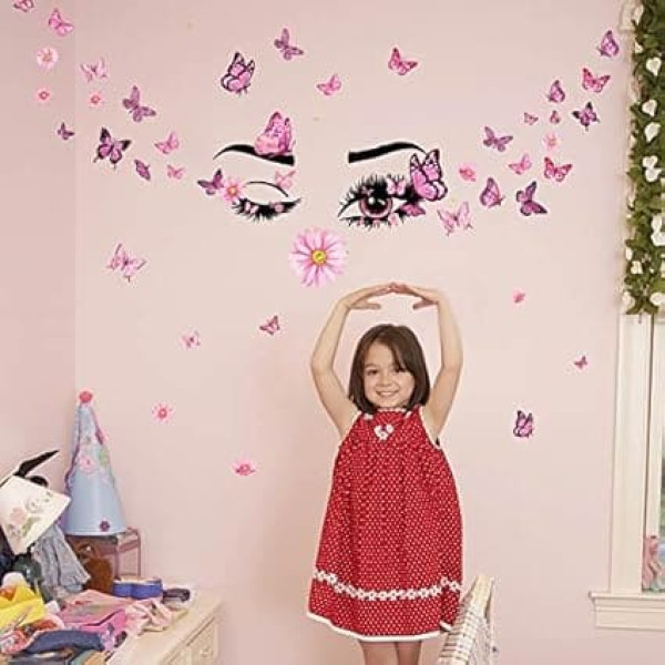 SUPERDANT Pink Eyelashes Wall Sticker Beautiful Girls Eyes Stickers Pink Flying Butterfly Wall Sticker Flower Decor DIY Art Wall for Couples Lovers Bedroom Living Room Decoration