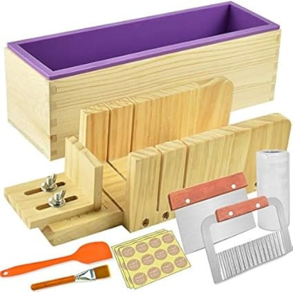 COMPLETE SET: 1 rectangular silicone mold, 1 rectangular wooden box, 1 adjustable wood loaf soap cutter, stainless steel wavy scraper & straight scraper, 36 label stickers, 1m long soap film, 1 brush and 1 silicone spatula Easy to use: pour the melted soap into the mould, wait for it to solidify, turn the mould over, release the purple silicone mould from the wooden box and then peel off the purple silicone mould from the intact solidified soap. Finally, use the wavy scraper or straight scraper to cut the soap into even blocks Multifunctional Soap Cutter with Adjustable Loaf This soap cutter has a scale and adjustment screw that allows you to cut exactly the thickness of the soap you want. It also has a blade at the bottom, which can trim the edge of the soap and make it smoother, making every soap you make into a delicate handwork BEST GIFT IDEA Our soap making kit is beautifully packaged in a gift box. This soap making kit is fun and easy to use, and everyone can easily make their own soap. Our soap making kit is a perfect choice for a gift International products have separate terms, are sold from abroad and may differ from local products, including fit, age ratings, and language of product, labeling or instructions. › See more product details