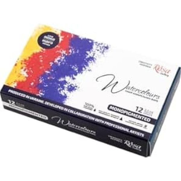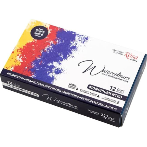 ■ ONOPIGMENTED Watercolour Set by ROSA Gallery (12 pieces) exclusively made of single pigment paints that allows you to get flawlessly pure blends and experiment with colour. It has two palettes with different configurations and a cuvette holder for easy mixing of watercolours. HIGH FADE FASTNESS & DURABILITY Store your artwork for years with a watercolor travel kit made of premium organic gum and inorganic pigments. PREMIUM QUALITY Non-toxic watercolor paints, perfect for adults, kids, art students and artists. Rosa's watercolor travel set was made in Ukraine and is popular in 36 countries PORTABLE WATERCOLOR SET Paint anywhere: park, beach, train, home, art class or in the studio. Perfect travel painting set. Great watercolours for adults. Suitable as a watercolor gift for friends and family Washable and easy to use. Master the art of painting with a watercolour set designed with simplicity and safety. Ideal for watercolour paper, canvas and watercolour boards. › See more product details; Product description Mono-pigmented set of 12 colours in indigo colours consists exclusively of single pigment colours that allows you to get perfectly clean blends and experiment with colour. The maximum lightfastness of almost all colours in a set guarantees the preservation of the artwork over time. ROSA Gallery watercolour paints are made from organic rubber and finely ground organic and inorganic pigments.; Product description Mono-pigmented set of 12 colours in indigo colours consists exclusively of single pigment colours that allows you to get perfectly clean blends and experiment with colour. The maximum lightfastness of almost all colours in a set guarantees the preservation of the artwork over time. ROSA Gallery watercolour paints are made from organic rubber and finely ground organic and inorganic pigments.; Mono-pigmented set of 12 colours in indigo colours consists exclusively of single pigment colours that allows you to get perfectly clean blends and experiment with colour. The maximum lightfastness of almost all colours in a set guarantees the preservation of the artwork over time. ROSA Gallery watercolour paints are made from organic rubber and finely ground organic and inorganic pigments.