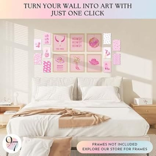 DISCO COWGIRL DECOR Printed on thick cardstock paper with modern technology, our pink western decor made of disco ball cowboy hat poster and cowboy boot decor poster has a smooth surface, matte finish with a subtle sheen that will bring your room full of pink western cowgirl style TRENDY WALL DECOR These preppy howdy posters and retro disco wall decor are pink. The poster can instantly become the focal point of the wall decor dorm and let coconut girls be happy all the time. They can be applied in bedroom, living room, pink dorm decor, cafe studio, etc PREMIUM SET FOR A BEAUTIFUL WALL DECOR You will get a set of 16 preppy pictures for wall with pink cowgirl hat, picture preppy wall art with different sizes (6pcs size 8x10 inch and 10pcs size 4x6 inch) and a set of pink cowgirl stickers. A double sided tape is also included to help you hang your preppy photos GREAT GIFT IDEA Surprise your loved ones with this pink disco cowgirl decoration on their birthday, housewarming, Thanksgiving, Christmas, New Year, etc. They are a fantastic retro western decor for your home that your loved ones are sure to love HIGH QUALITY: Printed on thick cardstock paper. Our western cowgirl boot decorations and cowgirl art for wall decor provide a more premium feel and durable finish than canvas prints. Careful packaging: the western wall collage kit is packaged in a sturdy gift box to ensure the quality of the product when it is delivered to you › See more product details; Product description cowgirl painting art poster vintage poster western country art wall art paintings canvas wall decor home decor living room decor aesthetic; Product description cowgirl painting art poster vintage poster western country art wall art paintings canvas wall decor home decor living room decor aesthetic; cowgirl painting art poster vintage poster western country art wall art paintings canvas wall decor home decor living room decor aesthetic
