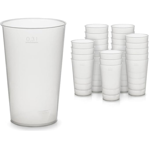 Quality: reusable drinking cup made of extra strong and shatter-proof plastic (polypropylene) for any event Sustainable and ecologically produced drinking containers, which are suitable for many washing processes High-quality processed and tested quality - Made in Germany Durable, dimensionally stable, scratch and dishwasher-safe quality reusable drinking cups High stacker – perfectly stackable thanks to internal stacking noses and easily separable › See more product details; Product description 25 x plastic drinking cups with 300 ml vol., plastic cups made of shatter-proof plastic for any large and small event. We have just the right cup for your event: whether garden party, barbecue, sporting event or children's birthday: wherever a safe alternative to the glass is sought, you can use the cups. Whether cold or hot drink, soft drinks or cocktail, with these cups you are always the perfect host. Stability meets lightness: Our reusable cups are made of highly transparent polypropylene and thanks to their low weight, dimensional stability and shatterproofness are the perfect drinking cups for any occasion. COMFORTABLE DRINKING & SPACE SAVING STORAGE The top edge of the cup is thickened, the so-called mouth roller. This ensures a pleasant drinking experience. The cups can be stacked inside each other and are easy to separate thanks to their internal stacking nodes. We think green: with this reusable cup, we offer you a sustainable and ecologically sensible drinking container. It is suitable for many washes. With the use of reusable cups, you not only save time and money, but also protect important natural resources. Our cups have the following dimensions (per cup) and features: - Height/top diameter/bottom diameter: 117 x 77 x 56 mm. - Weight: 30 g. - Transparent colour. - Volume (screed) 300 ml. - Scratch and dishwasher safe. - Dimensionally stable and long use. - High-quality processed tested quality.; Product description 25 x plastic drinking cups with 300 ml vol., plastic cups made of shatter-proof plastic for any large and small event. We have just the right cup for your event: whether garden party, barbecue, sporting event or children's birthday: wherever a safe alternative to the glass is sought, you can use the cups. Whether cold or hot drink, soft drinks or cocktail, with these cups you are always the perfect host. Stability meets lightness: Our reusable cups are made of highly transparent polypropylene and thanks to their low weight, dimensional stability and shatterproofness are the perfect drinking cups for any occasion. COMFORTABLE DRINKING & SPACE SAVING STORAGE The top edge of the cup is thickened, the so-called mouth roller. This ensures a pleasant drinking experience. The cups can be stacked inside each other and are easy to separate thanks to their internal stacking nodes. We think green: with this reusable cup, we offer you a sustainable and ecologically sensible drinking container. It is suitable for many washes. With the use of reusable cups, you not only save time and money, but also protect important natural resources. Our cups have the following dimensions (per cup) and features: - Height/top diameter/bottom diameter: 117 x 77 x 56 mm. - Weight: 30 g. - Transparent colour. - Volume (screed) 300 ml. - Scratch and dishwasher safe. - Dimensionally stable and long use. - High-quality processed tested quality.; 25 x plastic drinking cups with 300 ml vol., plastic cups made of shatter-proof plastic for any large and small event. We have just the right cup for your event: whether garden party, barbecue, sporting event or children's birthday: wherever a safe alternative to the glass is sought, you can use the cups. Whether cold or hot drink, soft drinks or cocktail, with these cups you are always the perfect host. Stability meets lightness: Our reusable cups are made of highly transparent polypropylene and thanks to their low weight, dimensional stability and shatterproofness are the perfect drinking cups for any occasion. COMFORTABLE DRINKING & SPACE SAVING STORAGE The top edge of the cup is thickened, the so-called mouth roller. This ensures a pleasant drinking experience. The cups can be stacked inside each other and are easy to separate thanks to their internal stacking nodes. We think green: with this reusable cup, we offer you a sustainable and ecologically sensible drinking container. It is suitable for many washes. With the use of reusable cups, you not only save time and money, but also protect important natural resources. Our cups have the following dimensions (per cup) and features: - Height/top diameter/bottom diameter: 117 x 77 x 56 mm. - Weight: 30 g. - Transparent colour. - Volume (screed) 300 ml. - Scratch and dishwasher safe. - Dimensionally stable and long use. - High-quality processed tested quality.