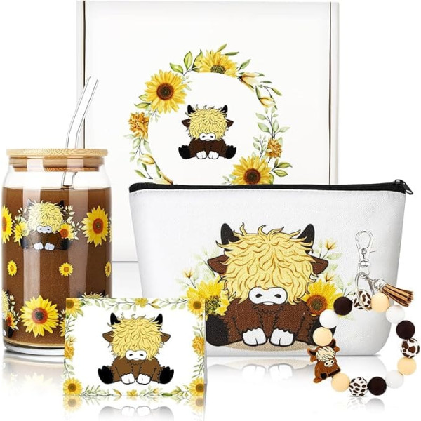 Highland Cow Glass Gift Set: an ideal blend of elegance and charm, specially curated for women who love cows. These cute cow gifts for women come with 1 highland cow cosmetic bag, 1 highland cow glass cup, 1 adorable highland cow keychain, 1 bracelet and 1 greeting card. Size details: the cosmetic bag is about 7.87 inches / 20 cm x 6.7 inches and offers enough space for your items, while the cow cup with lid and straw with a capacity of 16 ounces can hold enough liquids, ideal for iced coffee, cold brew, latte, tea, milk, juices, soda, sparkling water, beer, wine or water. BEAUTIFUL DESIGN The carefully selected items come together, the centerpiece is a 16 oz daisy glass tumbler, complete with lid and straw, providing a stylish and eco-friendly way to enjoy their favorite beverages. This unique gift set is ideal for moms and daughters, sisters, friends, aunts, grandmas, wives, teachers and all highland cow enthusiasts. High-quality drinking glass: 453.6 g/480 ml can glass cup with lid and straw is made of high-quality food grade borosilicate glass, stable. Decorated with a highland cow and sunflower, this glass mug is a unique blend of rustic charm and playfulness. Wide Applications You can give the Highland Cow gift set to friends to express your warm wishes. The person receiving it would feel the warmth; you can also use it on your daily days. › See more product details; Product description Highland Cow Glass Gift Set: 1 x Highland Cow Cosmetic Bag 1 Highland Cow Glass Mug 1 x Highland Cow Keyring 1 x Bracelet 1 Highland Cow Greeting Card; Product description Highland Cow Glass Gift Set: 1 x Highland Cow Cosmetic Bag 1 Highland Cow Glass Mug 1 x Highland Cow Keyring 1 x Bracelet 1 Highland Cow Greeting Card; Highland Cow Glass Gift Set: 1 x Highland Cow Cosmetic Bag 1 Highland Cow Glass Mug 1 x Highland Cow Keyring 1 x Bracelet 1 Highland Cow Greeting Card