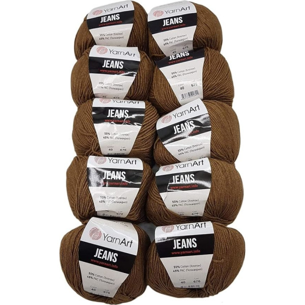 10 x 50 g YarnArt Jeans Knitting Wool Plain with 55% Cotton, 500 g Wool Plain (Brown 40)