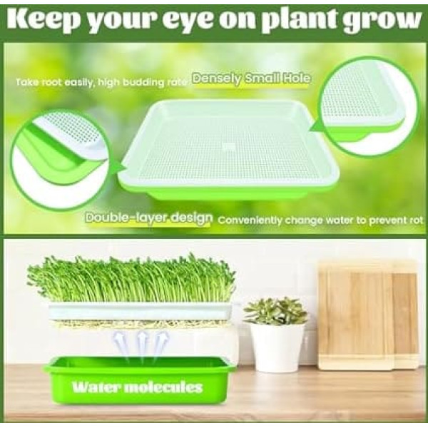 Microgreens plant tray: you will receive 10 sprout plant sets and 10 planting paper. Each set contains an inner tray and a bottom tray, the overall size is 12.75 x 10 x 4.72 inches, the large capacity can make the seeds grow better and faster, without soil, only water, even a garden novice can skewer beans easily. Durable & Healthy The sprouting tray is made of high quality food grade PP material, tasteless and durable. You can use this germination tray with cover with confidence and enjoy healthy and green food at home and add healthy vegetables to your table. Easy to use: The concave-convex design makes it easy to remove the inner mesh shell, the inner mesh shell provides excellent breathability and promotes seed germination, the mesh size is small enough to prevent the seeds from falling through. The transparent lid can keep your eye on the growth of micro greens Wide application: the germination container is perfect for the sprouts of micro greens of seeds, such as mung, wheatgrass, cat grass, peas, vanilla, radish, perilla, peanut, radish, alfalfa and other micro green seeds indoors and outdoors. Warm tips: Our propagation tray can sprout several types of seeds, and if the seeds are too small, you can place planting paper on the grid tray to prevent seeds from leaking. Do not place too many seeds so that they do not overlap and mould. Please keep the air ventilated and wait patiently for 3-10 days. › See more product details