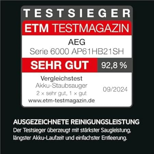AEG Series 6000 Cordless Vacuum Cleaner / Wireless / All Floors / Up to 99% Dust Absorption / Up to 50 Minutes Running Time / Easy to Use / Removable 21.6 V Battery / Lightweight / Includes