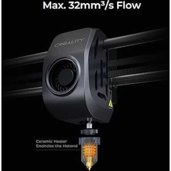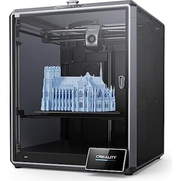 【600mm/s - King of Speed】With a print speed of 600mm/s and an acceleration of 20,000mm/s², the Creality K1 Max is 12 times faster than conventional FDM 3D printers, which greatly increases efficiency. 300 x 300 x 300 mm maximum capacity, efficient use of space: K1 Max has a large build volume of 300 x 300 x 300 mm, ideal for quick prototyping or design verification. It also offers a high build volume to printer size ratio of 25.5%. The K1 Max is the most size-efficient FDM 3D printer in its class. AI LiDAR and AI camera: The AI LiDAR with a resolution of 1 μm scans the first layer independently. The printing process will pause and you will be informed immediately if something goes wrong. K1 Max uses an AI camera to monitor spaghetti errors, foreign objects, dirt, etc. It alerts you when an error occurs. It also supports real-time monitoring and creates time lapse to share. Rigid frame and core XY for stable quality: the unibody frame made of die-cast aluminium alloy of the K1 Max is CNC machined to be precise and stiff. With the nimble core XY, the Creality K1 Max allows even printing at high speed. Improved ceramic hotend and double cooling: ceramic heater that surrounds the entire hotend It heats up to 200°C in 40 seconds and melts the filament immediately. Together with the large fan on the print head and an additional 18W fan in the chamber, the model hardens before threads and deformation occurs. G-sensor and improved Z axis for fine model textures: A G-sensor in the print head measures the resonance frequencies of high-speed printing and automatically tunes the printer to mitigate them. No more ghosting or ringing effects on the print. And the upgraded Z axis with more accurate positioning effectively reduces Z banding. › See more product details