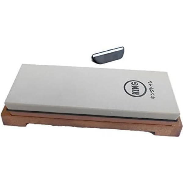 Sharpening stone made in Japan by King Whetstone: 1000 and 6000 grit combination, plastic including stand Dimensions of 1000/6000 stone: 185 x 63 x 25 mm Guide: 56 x 15 x 20 mm, optimal angle to ensure a very fine, sharp cutting edge › See more product details; Product description This set delivers savings over individual purchases. Contains: 1000/6000 grit combination whetstone, and a blade angle guide, which helps to maintain a constant and correct angle during sharpening. This guide is made of plastic and a ceramic rod. It is of excellent quality to stainless steel guides in terms of damage to whetstones.; Product description This set delivers savings over individual purchases. Contains: 1000/6000 grit combination whetstone, and a blade angle guide, which helps to maintain a constant and correct angle during sharpening. This guide is made of plastic and a ceramic rod. It is of excellent quality to stainless steel guides in terms of damage to whetstones.; This set delivers savings over individual purchases. Contains: 1000/6000 grit combination whetstone, and a blade angle guide, which helps to maintain a constant and correct angle during sharpening. This guide is made of plastic and a ceramic rod. It is of excellent quality to stainless steel guides in terms of damage to whetstones.