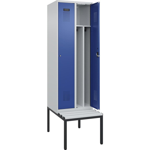 kaiserkraft | Spind Evolo Plus mit Trennwand mittig und Sitzbank | 2 Abteile | Trennwand mittig | lichtgrau/enzianblau | B 600 mm | Zylinderschloss | mit untergebauter Sitzbank | Kunststoff