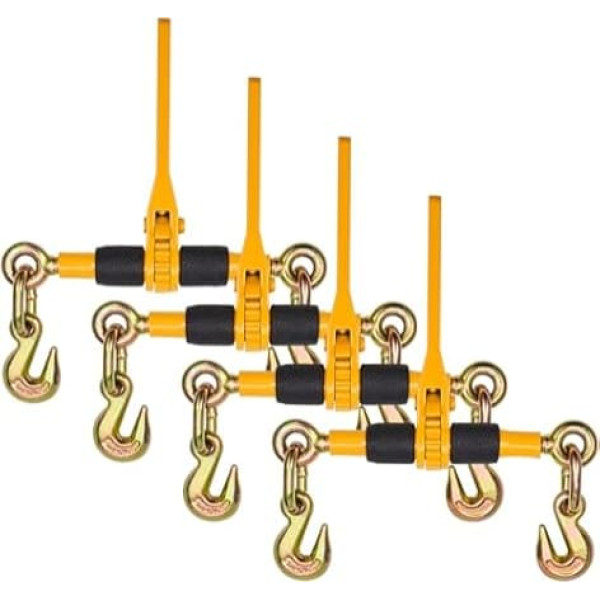 EFFORTLESS OPERATION With our lever structure ratchet chain tie, you can work effortlessly. Simply turn the handle and turn the threaded spindle to tighten or loosen your load effortlessly. This makes difficult tasks a breeze. 2600 lbs (1180 kg) strong load capacity: Our tow chain ratchet binder made of durable cast steel supports up to 2600 lbs (1180 kg) and is designed for load capacity under heavy loads. NON-SLIP RUBBER GRIP - Easily handle the heaviest loads. Our ratchet load binder has a rubber handle with nub structure that ensures a firm grip even with sweaty hands and allows easy operation without slipping. COMPATIBLE WITH 1/4-5/16 INCH CHAINS :Ready for chains between 1/4\