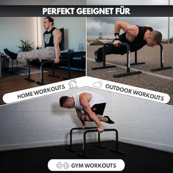 HIGHEST STABILITY: The GORNATION metal parallettes offer extreme durability with solid steel construction and non-slip feet that ensure unparalleled stability during calisthenics and fitness workouts. This stability allows you to safely perform even the most demanding exercises, from handstands to L-sits. Perfect grip: thanks to the black powder coating, the Parallettes offer an optimal grip. The 40 mm diameter ensures a secure hold on L-sits, handstands and more, which significantly increases your performance. This grip is particularly important during dynamic movements to prevent slipping and ensure your safety. Wrist protection during intensive exercises: Avoid overloading your wrists during push-ups and handstands with the GORNATION Parallettes. These ensure that you can train more painlessly and effectively, which is particularly important for calisthenics, yoga and functional fitness. Maximum exercise variety: use the parallettes for numerous exercises, both indoors and outdoors. They are perfect for learning handstand, L-sit and other demanding movements and increase your strength and flexibility. Ideal for advanced techniques and varied workouts. Easy to install: includes screws and tools, the parallettes are ready to use in minutes. With the included 10 m Grip Tape 2.0, you can also improve your grip, which is particularly beneficial for sweaty workouts. The assembly is quick and easy, so you can start your training immediately. › See more product details