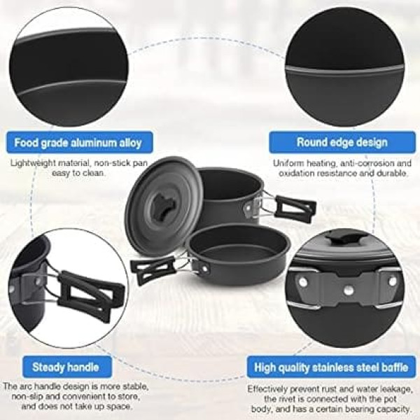 14-piece camping cookware set: our camping cookware set includes everything for a perfect outdoor dining experience. It includes 1 pan, 1 pot with lid, 1 kettle, outdoor cutlery, 3 BPA-free bowls, 1 BPA-free spoon, 1 wooden spoon, 1 cleaning sponge and a handy nylon carry bag. Space-saving and ultra-light: your camping cooking set is ideal for mountain camping, backpacking, picnics or campfire evenings. With folding handles and compact design, it fits effortlessly into your backpack. ️ DURABLE AND ELEGANCE Made from anodized aluminum with Teflon non-stick coating, our cookware ensures even heat distribution, longevity and easy cleanup after each use. Safe and healthy: our BPA-free bowls and spoons combined with the high-quality stainless steel cutlery ensure safe and healthy food during your outdoor adventures. Versatile and practical: whether hiking in the forest, motorhome trip or barbecue evening in the backyard - this camping cookware set reliably accompanies you on all culinary outdoor expeditions. › See more product details