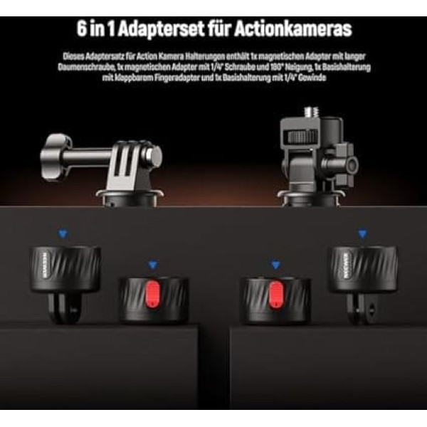 Action camera adapter set: this adapter set for the action camera mount contains 1 x magnetic adapter with long thumb screw, 1 x magnetic adapter with 1/4 inch screw and 180° tilt, 2 x base mount with 2 prongs, 2 x base mount with 1/4 inch thread Firm and quick magnetic attachment: The magnets equipped with magnets for action cameras can be attached and released with a simple twist, and the quick release button automatically locks into place to allow safe working on the go Suitable for most action cameras: NEEWER GP-24 tripod mount adapter accessory set with screw mount is compatible with GoPro Hero 13 12 11 10 9 8 7 Black; compatible with Insta360 X4 X3 Insta 360 Ace Pro Go 3S Go 3 2 combos; compatible with DJI Osmo Action 5 Pro Action 4 Action 3; compatible With AKASO Brave 8 7 4 Pack and other action cameras 1/4 inch and folding finger base holders: the 1/4 inch base holder is for tripods, selfie stick poles and handles. The folding finger base bracket can be attached to hands free helmet mounts, chest strap mounts, neck mounts, head mounts, chin strap mounts, backpack/hat clips, floating hand grips, wrist straps, suction cup holder, stroller/motorcycle/bicycle handlebar mounts For POV outdoor sports: This robust yet lightweight mounting adapter set is perfect for POV recordings of skateboarding, snowboarding, surfing, hiking, cycling, motorcycling and other outdoor activities › See more product details