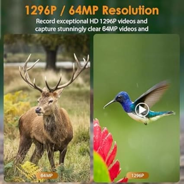 Super low light sensor: Sony Starvis image sensor built-in allows trail camera to take colour image even in low light and clear night version image in a total darkness. 48MP image and 1296P H.264 video: 48MP sharp image and 1296P with H.264 @ 32fps capture every moment of the wilderness clearer and smoother. Video in MP4 mode, compatible with multiple players. Photo and video model allows you to take photos and videos. 0.1 s lightning fast trigger speed: PR-activated technology for lighting 0.1 s trigger speed, super fast 0.5 s recovery time ensure that you do not miss a wonderful moment. The updated trail camera has a longer night version and trigger distance at 100ft/30m. Easy to use: insert SD card [accept max 512GB standard SD card (not included)] and batteries and play. Powered by 8 alkaline or lithium batteries (batteries not included). Unique keypad, 2.4 inch LCD colour screen, user-friendly UI designed, it is easy to play and review and manage the photos or videos you have taken. Other outstanding features: IP66 waterproof enable trail camera can work in harsh environments. Time-lapse function for biological observation. Time and date bars in each image. Long standby time up to 8 months. › See more product details