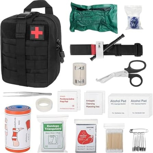 Multifunctional outdoor first aid set: medical tactical bag includes 46 basic emergency items that are needed in various emergency situations, and can be effectively used in traumas or other emergencies. Survival set first aid kit allows you to provide emergency help in time, whether you are hiking, camping or cycling. High-quality materials: the outdoor first aid set is made of high-quality nylon and has a size of 20 x 15 x 9 cm. It first aid kit military has a large capacity and a light weight to ensure durability and reliability. Survival set first aid kit is also well waterproof, moisture-resistant, crack-resistant and corrosion-resistant to ensure the life of the items in the bag. Unique design: first aid set outdoor has a compact and practical layout with a two-way zip that can be opened and closed smoothly and easily. The medical survival compact kit position and classification of the individual components are carefully planned to ensure quick access and quick operation. In an emergency, medical tactical bag can ensure that users can find what they need in no time. Multi-layer mesh bags: The outdoor first aid set is equipped with multi-layer mesh pockets with a sensible design, so that various emergency supplies can be neatly stored. All items in first aid tactical are individually packaged to effectively prevent dust and bacteria. The first aid set car multi-layer mesh bags improve flexibility and applicability and make it more practical. Suitable for any emergency: no matter what emergency, first aid tactical will quickly reduce the difficulty of rescue and is not only suitable for outdoor activities such as mountaineering, camping, gym, sports, hiking, cycling, but also for cars, travel or daily use at home. All materials of the first aid set outdoor comply with current standards. › See more product details