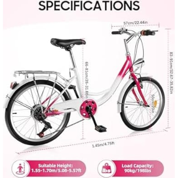 Adjustable speed and height: flywheel allows you to adjust six different speeds, travel different roads and meet your different needs. Height handlebar can be adjusted between 32.67 and 35.82 inches. Strong load capacity: The carbon steel frame, welding process and sturdy structure allow this product to withstand a maximum weight of 198 pounds, so that it can be used by people of different weights. Comfortable to ride: ergonomic handles with rubber cuffs ensure a comfortable grip and soft fit adapts well to the hips, ensuring comfortable sitting. Wind-resistant front fork with thin front part and thick side end. Safe use: front V-shaped brake and rear drum brake can ensure emergency braking. Non-slip pedals, dense spokes, the alarm bell, reflective devices and flexible 3S central axle ensure a safe ride. Selected materials: frame made of carbon steel, iron handle with CP coating, aluminium rims and steel chains are resistant to wear, corrosion, impact, deformation and breakage and ensure a long service life. › See more product details; Product description Specifications Colour: pink, white. General materials: carbon steel, iron, aluminum, steel, rubber Surface treatment: stoving enamel, welding process Brake type: V-brake (front), drum brake (rear). Handlebar: Xiaoyan 600 x 22.2 x 31.8. Rim: single layer thickened 1.75 x 32 H x 14 g. Outer tube: 20 x 1.75 m, smooth outer tube. Padding: highly elastic with positioning clip. Flywheel: 6S flywheel for mountain bike. Chain: 1/2 inch x 3/32 inch positioning chain. Chain length: 110 cm/43 inches. Brake lever: semi-aluminium three fingers (three fingers refers to the length of the brake handle). Gear lever: Saiguan 04 handlebar. Rear gear: Peak Domestic rear dial. Headlight: battery lamp. Handle surface treatment: CP coating. Thickness of carbon steel: 1.22 mm/0.048 inches. Number of speeds: 6. Suitable height: 1.55-1.70m/5.08-5.57ft. Armrest height: 83-91 cm/32.67-35.82 inches. Size of the rear seat: 32 x 15 cm/12.6 x 5.9 inches. Load capacity: max. 90 kg/198 lbs. Net weight: 13.6 kg/29.9 lbs. Vehicle length: 144 cm/56.69 inches. Handlebar width: 60 cm/23.62 inches. Height of the rear bracket above the ground: 55 cm/21.65 inches. Wheel diameter: 49 cm/20 inches. Distance between handle and cushion: 30 cm/11 inch. Package includes: 1 x 20 inch bicycle. Notes: 1. There are left and right markings on the foot pedal (L: left, R: right), please make sure the correct installation. 2. After you receive the product, please check whether the rear gear is in a vertical position before driving. If it is not vertical, please align Please manually align the rear gear before cycling to avoid scratches on the wheels.; Product description Specifications Colour: pink, white. General materials: carbon steel, iron, aluminum, steel, rubber Surface treatment: stoving enamel, welding process Brake type: V-brake (front), drum brake (rear). Handlebar: Xiaoyan 600 x 22.2 x 31.8. Rim: single layer thickened 1.75 x 32 H x 14 g. Outer tube: 20 x 1.75 m, smooth outer tube. Padding: highly elastic with positioning clip. Flywheel: 6S flywheel for mountain bike. Chain: 1/2 inch x 3/32 inch positioning chain. Chain length: 110 cm/43 inches. Brake lever: semi-aluminium three fingers (three fingers refers to the length of the brake handle). Gear lever: Saiguan 04 handlebar. Rear gear: Peak Domestic rear dial. Headlight: battery lamp. Handle surface treatment: CP coating. Thickness of carbon steel: 1.22 mm/0.048 inches. Number of speeds: 6. Suitable height: 1.55-1.70m/5.08-5.57ft. Armrest height: 83-91 cm/32.67-35.82 inches. Size of the rear seat: 32 x 15 cm/12.6 x 5.9 inches. Load capacity: max. 90 kg/198 lbs. Net weight: 13.6 kg/29.9 lbs. Vehicle length: 144 cm/56.69 inches. Handlebar width: 60 cm/23.62 inches. Height of the rear bracket above the ground: 55 cm/21.65 inches. Wheel diameter: 49 cm/20 inches. Distance between handle and cushion: 30 cm/11 inch. Package includes: 1 x 20 inch bicycle. Notes: 1. There are left and right markings on the foot pedal (L: left, R: right), please make sure the correct installation. 2. After you receive the product, please check whether the rear gear is in a vertical position before driving. If it is not vertical, please align Please manually align the rear gear before cycling to avoid scratches on the wheels.; Specifications Colour: pink, white. General materials: carbon steel, iron, aluminum, steel, rubber Surface treatment: stoving enamel, welding process Brake type: V-brake (front), drum brake (rear). Handlebar: Xiaoyan 600 x 22.2 x 31.8. Rim: single layer thickened 1.75 x 32 H x 14 g. Outer tube: 20 x 1.75 m, smooth outer tube. Padding: highly elastic with positioning clip. Flywheel: 6S flywheel for mountain bike. Chain: 1/2 inch x 3/32 inch positioning chain. Chain length: 110 cm/43 inches. Brake lever: semi-aluminium three fingers (three fingers refers to the length of the brake handle). Gear lever: Saiguan 04 handlebar. Rear gear: Peak Domestic rear dial. Headlight: battery lamp. Handle surface treatment: CP coating. Thickness of carbon steel: 1.22 mm/0.048 inches. Number of speeds: 6. Suitable height: 1.55-1.70m/5.08-5.57ft. Armrest height: 83-91 cm/32.67-35.82 inches. Size of the rear seat: 32 x 15 cm/12.6 x 5.9 inches. Load capacity: max. 90 kg/198 lbs. Net weight: 13.6 kg/29.9 lbs. Vehicle length: 144 cm/56.69 inches. Handlebar width: 60 cm/23.62 inches. Height of the rear bracket above the ground: 55 cm/21.65 inches. Wheel diameter: 49 cm/20 inches. Distance between handle and cushion: 30 cm/11 inch. Package includes: 1 x 20 inch bicycle. Notes: 1. There are left and right markings on the foot pedal (L: left, R: right), please make sure the correct installation. 2. After you receive the product, please check whether the rear gear is in a vertical position before driving. If it is not vertical, please align Please manually align the rear gear before cycling to avoid scratches on the wheels.