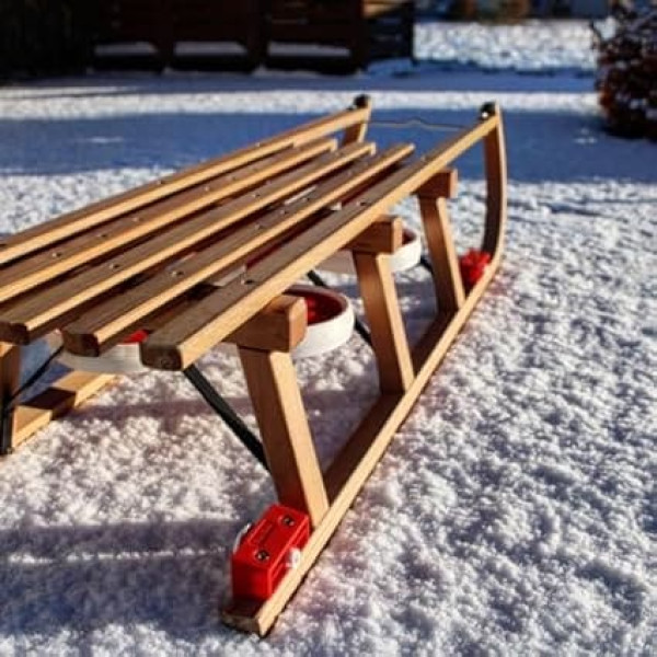Roll Rodel - 110 cm wooden sledge with wheels for rolling on tar - reversible solid rubber wheels - with bracket under seat / incl. pull rope - Davos toboggan 110 cm up to 80 kg load capacity