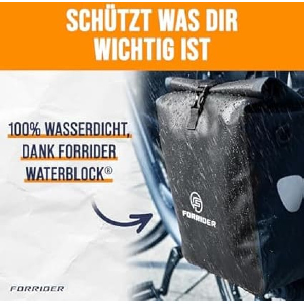 Freedom every day: with our Forrider basic bicycle bag and 22 litres of space, you are prepared for anything. Whether spontaneous shopping on the weekend or a picnic trip with friends. Come storm, rain or snow: at least it always stays dry in your Forrider bicycle bag thanks to our specially developed WaterBlock material. Does what it promises: thanks to the innovative Quicksafe carrying system, our bicycle bag holds securely on any pannier rack and can still be quickly and easily attached and removed. Excellent. Easy to use: not every bicycle bag can claim of itself. Our test winner has been tested according to strict testing procedures and has been found to be very good several times. Satisfaction: we at Forrider are absolutely convinced of our quality. Order now and rediscover cycling! › See more product details