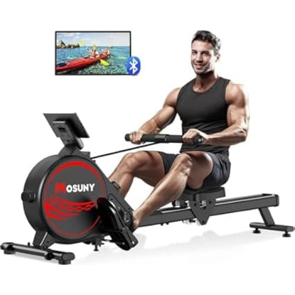 【16 Adjustable Resistance Levels】: Thanks to the easily adjustable resistance settings of the MOSUNY rowing machine, users can adjust their training to their fitness level and goals, from light cardio sessions to intense strength training. Combining a robust construction with advanced technological features, it is designed to provide an exceptional training experience tailored to both beginners and experienced fitness enthusiasts. 【Bluetooth App Compatible】: Connect the rowing machine to your smartphone or tablet via Bluetooth to easily access the KINOMAP fitness app. The rowing machine has a stand to hold your device, which greatly improves the available data and user experience. With which you can immerse yourself in nature while rowing at home! You can also attend professional rowing training courses, discover new challenges and improve! Double slide rail and ultra-quiet: We use a thickened commercial grade steel for this magnetic rowing machine to give it a better texture, durability that can withstand a maximum load of 160 kg. The magnetic resistance ensures a smooth rowing movement with minimal noise, making it ideal for home use without disturbing household members. 【7 Types of Data Display】: The LCD monitor tracks your rowing time, counts, total counting, 500 meters time, frequency, distance and calories in real time, so you can track your progress, set goals and participate in interactive training programs that increase your motivation and performance. In the device holder, you can place your smartphone and iPad to enjoy videos or music while using the rowing machine. 【Easy to Assemble and Store】: We have simplified the assembly process of the home rowing machine, most users can easily assemble the rowing machine in 20 minutes. With its small footprint, the MOSUNY magnetic rowing machine saves 70% storage space when stored upright. Equipped with wheels for effortless movement, so you can comfortably set up the device in your training area. 【Worry-Free Customer Service】: We promise our customers a 12-month component replacement service. Just contact us if you have any questions about this rowing machine! CONTACT US: Log in to your Amazon account > Find your orders > Click on seller > Click \