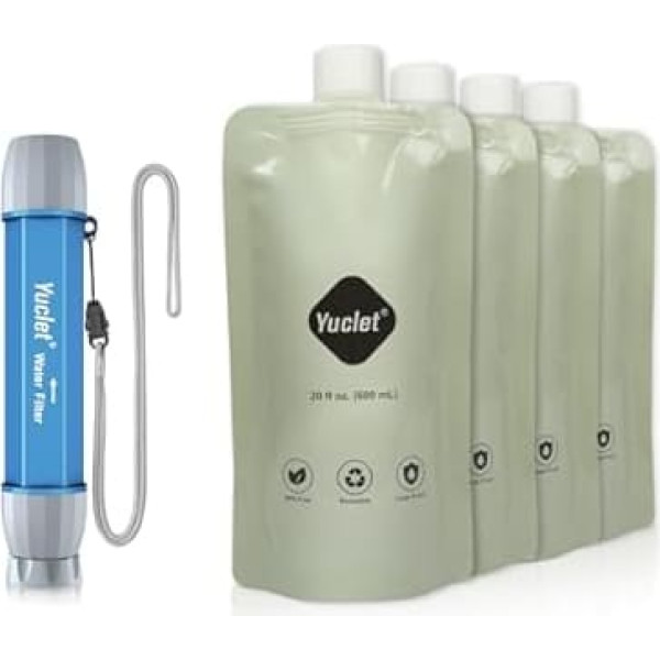 Each water filter straw is SGS certified (Test Report NBF23-0012700-03) to ensure reliable performance. Removes 99.9999% of pollutants and microplastics down to 0.1 microns. Provides up to 1,300 gallons of clean water per unit, with a maximum flow rate of 600ml/min. Lightweight and portable: water straw is compact (4.1 cm diameter, 20.8 cm length, 99.2 g), with 600 ml squeezable water bags. The water filter can be attached to the included water bags, most standard water/soda bottles with 28mm or 30mm thread, or used to drink directly from the source. It is also compatible with most gravity water filter systems. No drain worry with unlimited durability, always ready in your emergency go bag. Perfect for outdoor survival and essential water needs during activities such as hiking, camping, backpacking, traveling, emergency preparedness and hydration on the go. › See more product details; Product description Yuclet Squeeze Water Filter System with 4 Squeeze Water Bags, 0.1 Micron Water Filter Straw, Survival Gear for Camping, Travel, Backpacking, Hiking and Emergency Preparedness; Product description Yuclet Squeeze Water Filter System with 4 Squeeze Water Bags, 0.1 Micron Water Filter Straw, Survival Gear for Camping, Travel, Backpacking, Hiking and Emergency Preparedness; Yuclet Squeeze Water Filter System with 4 Squeeze Water Bags, 0.1 Micron Water Filter Straw, Survival Gear for Camping, Travel, Backpacking, Hiking and Emergency Preparedness