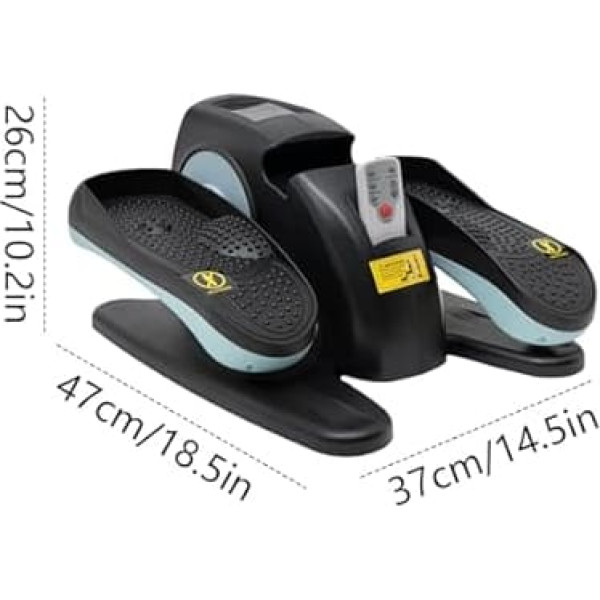 【Sturdy and Durable】: This product is made of iron, plastic and silicone and is manufactured by die casting, injection molding and welding process. It is characterised by high hardness, high wear resistance, corrosion protection and rust protection. High stability: the widened base plate can withstand a weight of 55.12 lbs, so it is suitable for most people without tipping over during training. The non-slip foot pads provide more stability and avoid scratches on the floor. 【Smart Life】: The LCD screen can display scanning, distance, calories, counter, speed and time. You can set start/stop, function, direction, speed, mode and on/off with the remote control or buttons on the screen. You can perform foot training while working, reading, watching TV or even holding a conference call. 【Meet your needs】: You can adjust the 5 speeds of 32/50/70/89/113 RPM and 3 modes (P1, P2, P3), which greatly meets your training needs. Easy to store: It is compact (13.78 x 17.32 x 10.24 inches), so you can easily store this product under your desk or in a storage room without taking up much space. › See more product details; Product description Details Storage Compartment It allows you to place small items, remote controls and cables inside. Concave handle: It is ergonomically designed and fits comfortably in the hand. It provides a comfortable and firm grip and allows for comfortable lifting and carrying of the product. Roller: The roller under the foot pedal ensures a smoother running of the device. Specifications Color: Blue, Black/Green, Black/Pink, Black Assembly Required: No Mounting Type: Floor Standing Material: iron, plastic, silicone. Remote control battery: 2 x AAA batteries (not included). Process: die casting, injection molding, welding Control method: remote control, buttons Screen type: LCD. Plug: EU standard. Voltage: 100-240V, 50, 60Hz. Power: 60 W. Mode: P1, P2, P3. Adjustable speeds: 5 gears (32/50/70/89/113 RPM) Load capacity: 25 kg/55.12 lbs. Product size: 35*44*26cm/13.78*17.32*10.24in Package size: 49*43.5*29cm/19.29*17.13*11.42in Gross weight: 7.5 kg / 16.53 lbs. Package includes: 1 x electric elliptical trainer. 1 x remote control. 1 x English manual. 1 x power cable. Notes: The remote control does not include batteries. You need to get 2 AAA batteries yourself. It is normal that the product generates heat during use, please do not touch it after prolonged use. Please do not stand on the pedal.; Product description Details Storage Compartment It allows you to place small items, remote controls and cables inside. Concave handle: It is ergonomically designed and fits comfortably in the hand. It provides a comfortable and firm grip and allows for comfortable lifting and carrying of the product. Roller: The roller under the foot pedal ensures a smoother running of the device. Specifications Color: Blue, Black/Green, Black/Pink, Black Assembly Required: No Mounting Type: Floor Standing Material: iron, plastic, silicone. Remote control battery: 2 x AAA batteries (not included). Process: die casting, injection molding, welding Control method: remote control, buttons Screen type: LCD. Plug: EU standard. Voltage: 100-240V, 50, 60Hz. Power: 60 W. Mode: P1, P2, P3. Adjustable speeds: 5 gears (32/50/70/89/113 RPM) Load capacity: 25 kg/55.12 lbs. Product size: 35*44*26cm/13.78*17.32*10.24in Package size: 49*43.5*29cm/19.29*17.13*11.42in Gross weight: 7.5 kg / 16.53 lbs. Package includes: 1 x electric elliptical trainer. 1 x remote control. 1 x English manual. 1 x power cable. Notes: The remote control does not include batteries. You need to get 2 AAA batteries yourself. It is normal that the product generates heat during use, please do not touch it after prolonged use. Please do not stand on the pedal.; Details Storage Compartment It allows you to place small items, remote controls and cables inside. Concave handle: It is ergonomically designed and fits comfortably in the hand. It provides a comfortable and firm grip and allows for comfortable lifting and carrying of the product. Roller: The roller under the foot pedal ensures a smoother running of the device. Specifications Color: Blue, Black/Green, Black/Pink, Black Assembly Required: No Mounting Type: Floor Standing Material: iron, plastic, silicone. Remote control battery: 2 x AAA batteries (not included). Process: die casting, injection molding, welding Control method: remote control, buttons Screen type: LCD. Plug: EU standard. Voltage: 100-240V, 50, 60Hz. Power: 60 W. Mode: P1, P2, P3. Adjustable speeds: 5 gears (32/50/70/89/113 RPM) Load capacity: 25 kg/55.12 lbs. Product size: 35*44*26cm/13.78*17.32*10.24in Package size: 49*43.5*29cm/19.29*17.13*11.42in Gross weight: 7.5 kg / 16.53 lbs. Package includes: 1 x electric elliptical trainer. 1 x remote control. 1 x English manual. 1 x power cable. Notes: The remote control does not include batteries. You need to get 2 AAA batteries yourself. It is normal that the product generates heat during use, please do not touch it after prolonged use. Please do not stand on the pedal.