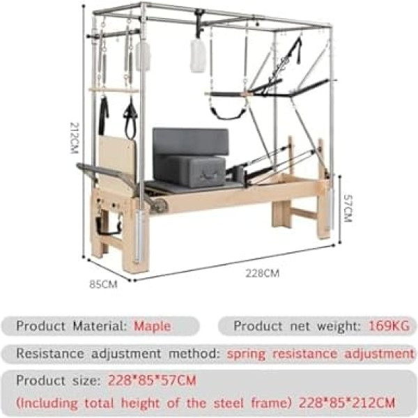 The net weight of this Pilates reformer is 165 kg and the total height including the steel frame is 228 x 85212 cm. ✨Multifunctional Resistance Option This Pilates reformer comes with 6 adjustable resistance cables with a total of seven adjustment levels. Perfect for beginners, practice Pilates at home between studio sessions. ✨Adjustable Foot Bar and Padded Carriage: Pilates Reformer Yoga Equipment for Home with Adjustable Rope Position. The sponge pads are filled with high density foam to ensure optimal support during training. ✨ High-quality materials: Pilates reformer machine, made of a sturdy aluminium alloy frame and durable parts, which ensure higher load capacity and deformation resistance. The saddle bags are made of durable, high density sponge, which is designed for a long service life. ✨ Home Studio Premium Pilates: Experience the incredible benefits of Pilates workouts in the gym from the comfort of your own home. Ideal for strength training, strengthening and improving flexibility and endurance. › See more product details; Product description Home Reformer Pilates Device, Pilates Fitness Equipment ● Functions: 1. The soft bag is made of high-quality leather, which is comfortable to the touch, soft and breathable, does not sweat, is scratch/sweat resistant and fun 2. Sturdy steel frame, higher load capacity/rust protection, stable and reliable, not easy to deform. 3. Adjustable spring with high elasticity, which can be adjusted according to the intensity of your training. 4. The intensity can be adjusted to the needs of people of different sizes and is easy to adjust ● Specifications: Name: Pilates Yoga Bed Material: steel frame/ABS/PP/sponge ● Precautions: 1:There may be slight color difference due to computer monitor settings. 2: Different measurement methods, please allow a size deviation of 1-3 cm.; Product description Home Reformer Pilates Device, Pilates Fitness Equipment ● Functions: 1. The soft bag is made of high-quality leather, which is comfortable to the touch, soft and breathable, does not sweat, is scratch/sweat resistant and fun 2. Sturdy steel frame, higher load capacity/rust protection, stable and reliable, not easy to deform. 3. Adjustable spring with high elasticity, which can be adjusted according to the intensity of your training. 4. The intensity can be adjusted to the needs of people of different sizes and is easy to adjust ● Specifications: Name: Pilates Yoga Bed Material: steel frame/ABS/PP/sponge ● Precautions: 1:There may be slight color difference due to computer monitor settings. 2: Different measurement methods, please allow a size deviation of 1-3 cm.; Home Reformer Pilates Device, Pilates Fitness Equipment ● Functions: 1. The soft bag is made of high-quality leather, which is comfortable to the touch, soft and breathable, does not sweat, is scratch/sweat resistant and fun 2. Sturdy steel frame, higher load capacity/rust protection, stable and reliable, not easy to deform. 3. Adjustable spring with high elasticity, which can be adjusted according to the intensity of your training. 4. The intensity can be adjusted to the needs of people of different sizes and is easy to adjust ● Specifications: Name: Pilates Yoga Bed Material: steel frame/ABS/PP/sponge ● Precautions: 1:There may be slight color difference due to computer monitor settings. 2: Different measurement methods, please allow a size deviation of 1-3 cm.