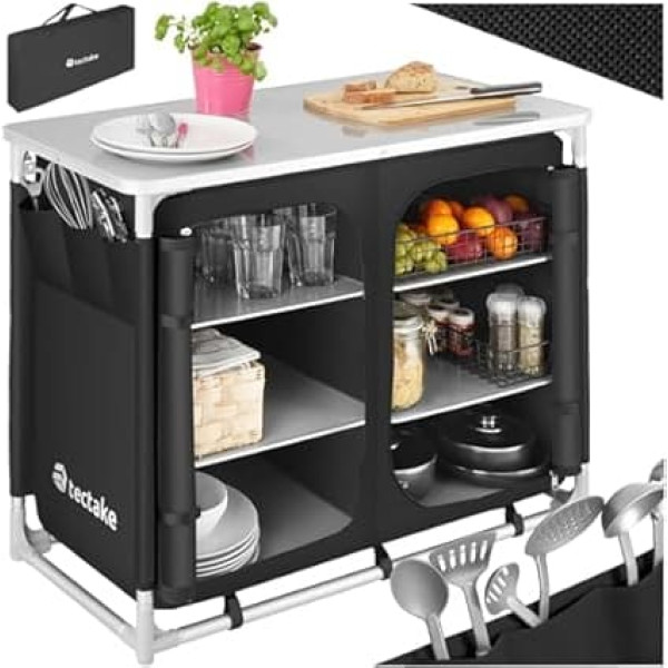 Large storage space: Discover the ideal solution for your holiday, festival or for the home garden: our mobile kitchen cabinets not only offer generous storage space, but can also be dismantled extremely compactly. With the three-piece outer pocket, you have quick access to your kitchen utensils or camping gadgets, while the lockable storage compartments with aluminium-reinforced inner plates provide additional safety and order. Folding camping table with stability: experience the perfect blend of comfort and functionality. The back of the storage compartments is partially equipped with mesh fabric, which ensures good air circulation and keeps your food fresh. In addition, the high stability of the kitchen cabinet, supported by height-adjustable feet, guarantees a secure stand on any surface, whether you set up your mini kitchen in the awning caravan or on the campground. Lightweight and mobile: plan your next adventure without compromise. Our folding camping table impresses with its low weight and easy assembly, which makes the kitchen cabinet with worktop the ideal companion for any outdoor experience. Packed in the included carry bag, this camping table is easy to transport and quickly ready to use. Compatible camping cooking set: maximise your outdoor comfort with our camping cabinet, which fits perfectly into any kitchen tent. Whether camping, glamping or camper expansion, enjoy the freedom to have a fully equipped kitchen anywhere. Thanks to the innovative construction and lightweight materials such as our outdoor fabric, our multifunctional table is the ideal extension for kitchen accessories. Tent accessories must-have: our folding camping cabinet is more than just camping accessories - the camping furniture is an indispensable companion for any camping adventure. The combination of functionality, design and robustness makes it the perfect addition to your camping equipment. With the easy integration into your camp, you can experience cooking in nature on a new level. › See more product details; Product description The practical camping cabinet from tectake offers large storage space with a small footprint. The assembly and disassembly is very quick and easy. The kitchen box is equipped with a robust work surface and six large compartments. The mesh fabric on the back ensures sufficient ventilation. The legs are separately adjustable, so that the kitchen unit stands stable on any surface. With the spacious camping cabinet from tectake you can keep an overview and order as a chef even in the open air. Highlights: Large storage space. Very compact to disassemble. Lockable storage compartments with aluminium-reinforced inner plates. Back of the storage compartments partly with mesh fabric for good air circulation. Three-piece exterior pocket Great stability. Height adjustable feet. Lightweight Easy to assemble. Carry bag included Technical details: Total dimensions (W x D x H): approx. 97 x 47.5 x 78 cm. Dimensions when folded (W x D x H): approx. 97 x 47.5 x 14 cm. Work surface (W x D): approx. 97 x 47.5 cm. Outer pocket (W x H): approx. 38 x 16 cm. Compartment openings (W x H): approx. 36 x 58 cm. Top compartments (W x D x H): approx. 42.5 x 40.5 x 23 cm. Middle compartments (W x D x H): approx. 42.5 x 40.5 x 22 cm. Lower compartments (W x D x H): approx. 42.5 x 40.5 x 21 cm. Mesh fabric (W x H): approx. 22.5 x 11.5 cm. Thickness of fibreboard: approx. 0.5 cm. Diameter of aluminium tubes: approx. 2.5 cm. Feet adjustable: up to 1.5 cm. Load capacity: max. 30 kg (even distribution). Weight: approx. 8.6 kg. Material: aluminium, fibreboard (MDF), polyester (Oxford). Package includes: camping cabinet Assembly instructions. carry bag; Product description The practical camping cabinet from tectake offers large storage space with a small footprint. The assembly and disassembly is very quick and easy. The kitchen box is equipped with a robust work surface and six large compartments. The mesh fabric on the back ensures sufficient ventilation. The legs are separately adjustable, so that the kitchen unit stands stable on any surface. With the spacious camping cabinet from tectake you can keep an overview and order as a chef even in the open air. Highlights: Large storage space. Very compact to disassemble. Lockable storage compartments with aluminium-reinforced inner plates. Back of the storage compartments partly with mesh fabric for good air circulation. Three-piece exterior pocket Great stability. Height adjustable feet. Lightweight Easy to assemble. Carry bag included Technical details: Total dimensions (W x D x H): approx. 97 x 47.5 x 78 cm. Dimensions when folded (W x D x H): approx. 97 x 47.5 x 14 cm. Work surface (W x D): approx. 97 x 47.5 cm. Outer pocket (W x H): approx. 38 x 16 cm. Compartment openings (W x H): approx. 36 x 58 cm. Top compartments (W x D x H): approx. 42.5 x 40.5 x 23 cm. Middle compartments (W x D x H): approx. 42.5 x 40.5 x 22 cm. Lower compartments (W x D x H): approx. 42.5 x 40.5 x 21 cm. Mesh fabric (W x H): approx. 22.5 x 11.5 cm. Thickness of fibreboard: approx. 0.5 cm. Diameter of aluminium tubes: approx. 2.5 cm. Feet adjustable: up to 1.5 cm. Load capacity: max. 30 kg (even distribution). Weight: approx. 8.6 kg. Material: aluminium, fibreboard (MDF), polyester (Oxford). Package includes: camping cabinet Assembly instructions. carry bag; The practical camping cabinet from tectake offers large storage space with a small footprint. The assembly and disassembly is very quick and easy. The kitchen box is equipped with a robust work surface and six large compartments. The mesh fabric on the back ensures sufficient ventilation. The legs are separately adjustable, so that the kitchen unit stands stable on any surface. With the spacious camping cabinet from tectake you can keep an overview and order as a chef even in the open air. Highlights: Large storage space. Very compact to disassemble. Lockable storage compartments with aluminium-reinforced inner plates. Ba