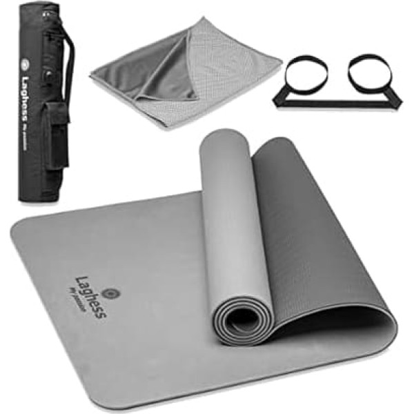 Double Layer: Fitness mat with different density, 6mm thickness, for support and slip resistance. Dimensions/Weight: Padded Non-Slip Fitness Mat (TPE) 183 cm x 61 cm x 0.6 cm, 715 g. 4 Colors: Yoga Mat Fitness Mat, Available in 4 Colors: Light Blue, Green, Purple, Grey. Accessories: non-slip yoga mat + bag (72 x 15 black) + towel (30 x 90 microfibre) SATISFACTION OR MONEY BACK GUARANTEE You can do the fitness/yoga mat for no reason › See more product details; Product description The Laghess yoga mat is made entirely of thermoplastic rubber and using a new technological process, which makes it excellent wear resistance compared to most standard mats and mats. Our fitness mat is completely environmentally friendly, hypoallergenic, elastic, waterproof, odourless, recyclable and biodegradable and can be easily washed by hand or cleaned with non-aggressive products. The double layer with different density and 6 mm thickness ensures optimal support at any point and ensures a non-slip effect. The size of 183 x 61 cm makes the exercise mat suitable for a variety of uses: sports and fitness, relaxation and massage that can be used in any environment. It is lightweight (715 g) and available in four different colour combinations: blue-light blue, green-black, purple-purple, grey-black. Comes complete with its reinforced polyester fibre technical pouch with double zip closure and two handy storage pockets: one with Velcro closure and one with safety lock to keep various items such as smartphone, money, water bottles within easy reach. It also has a USB cable to connect a power bank (not included) so you can charge your smartphone or tablet at any time. Complete the set with a comfortable microfibre towel (30 x 90 cm) in colour to match the mat designed to wear around the neck or tie around the shoulder strap, and used to absorb excess sweat or as a hygienic towel. The combination of comfort, design and technology makes the Laghess Kit an ideal solution for everyday use in different situations, whether it be at work, for fitness professionals, sports/relaxation for enthusiasts, or as a gift for men, women and children. Complete your home gym equipment, buy the Laghess fitness mat now.; Product description The Laghess yoga mat is made entirely of thermoplastic rubber and using a new technological process, which makes it excellent wear resistance compared to most standard mats and mats. Our fitness mat is completely environmentally friendly, hypoallergenic, elastic, waterproof, odourless, recyclable and biodegradable and can be easily washed by hand or cleaned with non-aggressive products. The double layer with different density and 6 mm thickness ensures optimal support at any point and ensures a non-slip effect. The size of 183 x 61 cm makes the exercise mat suitable for a variety of uses: sports and fitness, relaxation and massage that can be used in any environment. It is lightweight (715 g) and available in four different colour combinations: blue-light blue, green-black, purple-purple, grey-black. Comes complete with its reinforced polyester fibre technical pouch with double zip closure and two handy storage pockets: one with Velcro closure and one with safety lock to keep various items such as smartphone, money, water bottles within easy reach. It also has a USB cable to connect a power bank (not included) so you can charge your smartphone or tablet at any time. Complete the set with a comfortable microfibre towel (30 x 90 cm) in colour to match the mat designed to wear around the neck or tie around the shoulder strap, and used to absorb excess sweat or as a hygienic towel. The combination of comfort, design and technology makes the Laghess Kit an ideal solution for everyday use in different situations, whether it be at work, for fitness professionals, sports/relaxation for enthusiasts, or as a gift for men, women and children. Complete your home gym equipment, buy the Laghess fitness mat now.; The Laghess yoga mat is made entirely of thermoplastic rubber and using a new technological process, which makes it excellent wear resistance compared to most standard mats and mats. Our fitness mat is completely environmentally friendly, hypoallergenic, elastic, waterproof, odourless, recyclable and biodegradable and can be easily washed by hand or cleaned with non-aggressive products. The double layer with different density and 6 mm thickness ensures optimal support at any point and ensures a non-slip effect. The size of 183 x 61 cm makes the exercise mat suitable for a variety of uses: sports and fitness, relaxation and massage that can be used in any environment. It is lightweight (715 g) and available in four different colour combinations: blue-light blue, green-black, purple-purple, grey-black. Comes complete with its reinforced polyester fibre technical pouch with double zip closure and two handy storage pockets: one with Velcro closure and one with safety lock to keep various items such as smartphone, money, water bottles within easy reach. It also has a USB cable to connect a power bank (not included) so you can charge your smartphone or tablet at any time. Complete the set with a comfortable microfibre towel (30 x 90 cm) in colour to match the mat designed to wear around the neck or tie around the shoulder strap, and used to absorb excess sweat or as a hygienic towel. The combination of comfort, design and technology makes the Laghess Kit an ideal solution for everyday use in different situations, whether it be at work, for fitness professionals, sports/relaxation for enthusiasts, or as a gift for men, women and children. Complete your home gym equipment, buy the Laghess fitness mat now.