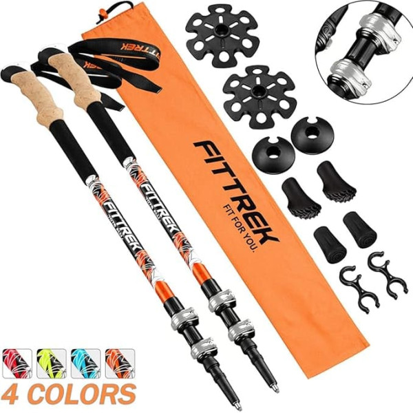 IDEAL FOR EVERYONE - FitTrek Trekking Poles are a great choice for everyone from beginners to experts, kids, teens, adults and seniors. Our versatile trekking poles allow anyone from 70 cm to 180 cm will have no problems with using our poles ERGONOMIC & COMFORTABLE - FitTrek trekking poles are designed with non-slip natural cork handles and soft foam grip, keeping hands cool and dry during long hikes. Extended soft foam handle with extra padded wrist straps, easily adjustable, safety release and more comfort GREAT FEATURES - Each hiking pole set comes with 4 kinds of rubber tips for using the poles on mud, snow, sidewalk or smooth rocks. They also have an integrated carbide tip for gravel, hard-packed trails or ice. Latest Patent Lever Lock - 30% smaller, 20% lighter and 25% higher holding power, quick and easy to adjust even when wearing gloves. Extremely quick adjustment of pole length from 26\; Product description Specifications: Construction: adjustable. Handle: Aluminium 7075: natural cork handles and soft foam handle. 3K carbon: soft foam grip. Aluminium 6061: Adapts to the hand comfortable grip + soft foam handle. Children: fits the hand Comfortable handles. Strap: padded wrist strap. Segments: 3 pieces (children: 2 pieces). Shaft diameter: 18 mm, 16 mm, 14 mm. Locking system: patent lock. Basket: tip guards, rubber feet, mud baskets, snow baskets. Tip: Tungsten Carbide Tip Length/Size: 26\; Product description Specifications: Construction: adjustable. Handle: Aluminium 7075: natural cork handles and soft foam handle. 3K carbon: soft foam grip. Aluminium 6061: Adapts to the hand comfortable grip + soft foam handle. Children: fits the hand Comfortable handles. Strap: padded wrist strap. Segments: 3 pieces (children: 2 pieces). Shaft diameter: 18 mm, 16 mm, 14 mm. Locking system: patent lock. Basket: tip guards, rubber feet, mud baskets, snow baskets. Tip: Tungsten Carbide Tip Length/Size: 26\; Specifications: Construction: adjustable. Handle: Aluminium 7075: natural cork handles and soft foam handle. 3K carbon: soft foam grip. Aluminium 6061: Adapts to the hand comfortable grip + soft foam handle. Children: fits the hand Comfortable handles. Strap: padded wrist strap. Segments: 3 pieces (children: 2 pieces). Shaft diameter: 18 mm, 16 mm, 14 mm. Locking system: patent lock. Basket: tip guards, rubber feet, mud baskets, snow baskets. Tip: Tungsten Carbide Tip Length/Size: 26\