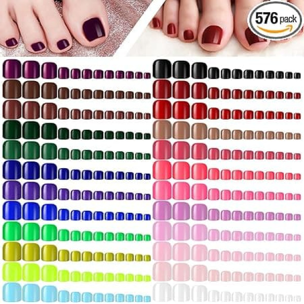 Fake Toenails Kit: you will receive 576 pieces short square toenails (have many classic colors, black, white, red, yellow, brown, 24 tips each), these colors are perfect all year round. DIFFERENT SIZE:Artificial toe tips have a size of 10, and it is easy to choose the appropriate size for each toenail. High quality: toenail tips are made of material, no toxins, no smell. You can also paint with colourful varnish or use with glitter, powder, sequins, stickers and other nail accessories to create your own nail idea. Convenient to Use The way this press is applied to shiny toenails is convenient and easy for nail art lovers and learners to use. First you need to clean the surface of the nails, then cut to the desired shape and next select the false toe nails of ideal size and colour, press these false toenails patiently with glue on your own nails, glue is not included. Multiple Application The acrylic bottle nail tips are suitable for both professional nail specialists and nail art learners. They are suitable for nail salons and DIY nail art at home, are a wonderful gift for your wife, girlfriend, mother or sisters and are ideal for parties / weddings / costume ball / Halloween / Christmas / etc. › See more product details