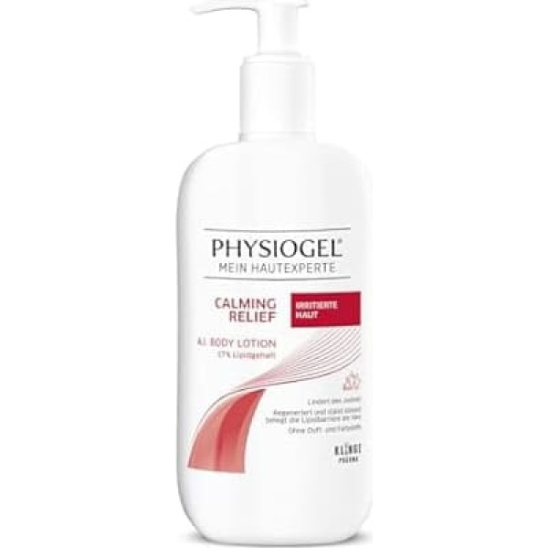 Physiogel Calming Relief A.I. Creme Body lotion soothes dry, itchy and reddened skin. The Calming Relief A.I. body lotion strengthens and regenerates the skin's lipid barrier for less sensitive skin, clinically proven. Physical gel CR A.I. body lotion moisturises to restore smooth, supple skin. Hypoallergenic: Free from perfume and dyes. Lipid content 17 %. › See more product details; Product description Product Description PHYSIOGEL Calming Relief A.I. Body LotionDie Calming Relief A.I. Body lotion has been specially developed for dry, itchy or irritated skin. With the triple care effect against dryness, itching and irritation. Thanks to the advanced Physiogel BioMimetic technology and skin-related lipids, the skin lipid barrier is naturally regenerated and strengthened - for smooth, supple, less sensitive skin. The calming relief A.I. Product care series is suitable as a basic care for skin prone to eczema. Also suitable for babies and children, from the 1st Tag.Lipid content: 17%Hypoallergenic: No perfume and no dyesRecommended by dermatologists. Directions Apply twice a day or to the skin as needed. Suitable for the whole body. Legal Disclaimer Stiefel Laboratories, a GSK company See more; Product description Product Description PHYSIOGEL Calming Relief A.I. Body LotionDie Calming Relief A.I. Body lotion has been specially developed for dry, itchy or irritated skin. With the triple care effect against dryness, itching and irritation. Thanks to the advanced Physiogel BioMimetic technology and skin-related lipids, the skin lipid barrier is naturally regenerated and strengthened - for smooth, supple, less sensitive skin. The calming relief A.I. Product care series is suitable as a basic care for skin prone to eczema. Also suitable for babies and children, from the 1st Tag.Lipid content: 17%Hypoallergenic: No perfume and no dyesRecommended by dermatologists. Directions Apply twice a day or to the skin as needed. Suitable for the whole body. Legal Disclaimer Stiefel Laboratories, a GSK company See more; Product Description PHYSIOGEL Calming Relief A.I. Body LotionDie Calming Relief A.I. Body lotion has been specially developed for dry, itchy or irritated skin. With the triple care effect against dryness, itching and irritation. Thanks to the advanced Physiogel BioMimetic technology and skin-related lipids, the skin lipid barrier is naturally regenerated and strengthened - for smooth, supple, less sensitive skin. The calming relief A.I. Product care series is suitable as a basic care for skin prone to eczema. Also suitable for babies and children, from the 1st Tag.Lipid content: 17%Hypoallergenic: No perfume and no dyesRecommended by dermatologists. Directions Apply twice a day or to the skin as needed. Suitable for the whole body. Legal Disclaimer Stiefel Laboratories, a GSK company See more