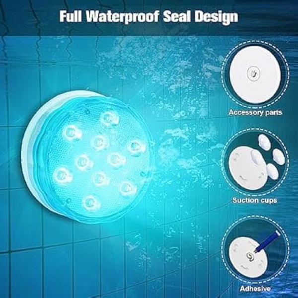 Innovative magnetic base: the round magnetic base allows for effortless attachment and removal of the lights. The strong built-in magnet allows for easy attachment to the base and can be securely fixed to different surfaces with adhesive or suction cups. Whether the surface is level or uneven, above or underwater, our pool lights underwater ensure convenient and reliable use. VERSATILE FIXING OPTIONS Our pool lights feature a remarkable adhesive that can be used both underwater and dry, so you can easily stick the base to any surface, regardless of its flatness or unevenness. In addition, we offer four suction cups with a diameter of 30 mm, which provide strong suction power, perfect for attaching underwater lighting to flat and smooth surfaces. Waterproof and corrosion resistant: our underwater LED pool lamps are fully sealed according to IPX8, so that no water can leak and the magnet does not corrode. The strong built-in magnet securely attaches the light to the base, making it suitable for both flat and uneven surfaces, whether above or under water. VIBRANT COLOR OPTIONS Choose from an extensive selection of 25 colors that give you the most color options on the market. Each colour can be shown and hidden separately to create captivating lighting effects. Enjoy up to 5 dynamic modes for added versatility. Extended battery life: our underwater pool light has the highest battery capacity on the market, with an impressive rechargeable battery of 2600 mAh. Experience a significantly longer service life compared to lights powered by AA batteries. Say goodbye to frequent battery changes and enjoy continuous lighting. SUPERIOR WATERPROOF DESIGN: Our pool lights are designed with a truly waterproof structure, including a fully sealed charging port. Unlike lights with Type-C or DC ports that can be damaged by water, our underwater lights have a magnetic charging port that prevents water ingress and damage to the lights. 100% SATISFACTION GUARANTEE We stand behind our product with 1 year unconditional replacement or refund policy. Contact us if you need help and we will ensure your complete satisfaction. Buy with confidence and experience exceptional support. › See more product details