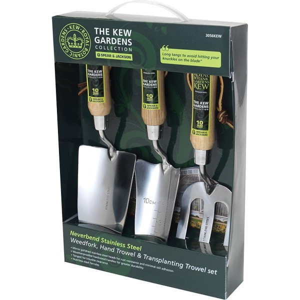 Developed in conjunction with Kew's horticultural team, resulting in an officially licensed tool which is used & recommended by Kew Gardens Designed with longer tangs to reduce the chance of scraped knuckles or hitting them on the blades Mirror polished stainless steel heads slip easily through soil, provides resistance to rust, minimal soil adhesion and easier cleaning FSC approved and weatherproofed Ash handles, 127mm (5\