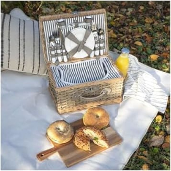 CONVENIENCE Enjoy a stress-free picnic for 4 with our basket. Space: a large cooling compartment with 14 litre capacity (35 x 24 x 15 cm) offers plenty of space for your food and drinks. ELEGANCE The wicker basket with linen and cotton lining adds a touch of sophistication to your outdoor trip. Ease of Use 23 accessories included to make your picnic complete and enjoyable for all. DURABILITY The 4 knives, 4 forks and 4 spoons made of stainless steel guarantee long-lasting use for many upcoming picnics. Style: The 4 ceramic plates diameter 18 cm and the 4 wine glasses with 18 cl add a touch of elegance to your outdoor dining. Practicality: the included bottle opener, salt and pepper shakers simplify the preparation and seasoning of your dishes. Easy: the dishwasher-safe accessory makes cleaning after the picnic quick and effortless. PORTABILITY Weighing only 5.8 pounds, our picnic basket is easy to carry and handle, ideal for all your outdoor adventures. › See more product details; Product description Discover the ideal picnic basket for your outdoor holiday with family or friends. Our stylish wicker basket is specially designed for up to 4 people and contains everything you need for an unforgettable picnic. With a spacious 14 litre cooler compartment (40 x 20 cm), this basket keeps your food and drinks at the ideal temperature and ensures an optimal dining experience anywhere. In addition, the insulating lining provides extra protection for your supplies, even on hot days. Compact and lightweight, our picnic basket is equipped with a faux leather handle, making it easy to carry when you are on the go. Whether for a day at the beach, a walk in the woods or an outdoor concert, this basket will accompany you in style and practically anywhere. Enjoy cosy moments outdoors with our 4 person picnic basket. Order today and get ready for unforgettable moments in the middle of nature.; Product description Discover the ideal picnic basket for your outdoor holiday with family or friends. Our stylish wicker basket is specially designed for up to 4 people and contains everything you need for an unforgettable picnic. With a spacious 14 litre cooler compartment (40 x 20 cm), this basket keeps your food and drinks at the ideal temperature and ensures an optimal dining experience anywhere. In addition, the insulating lining provides extra protection for your supplies, even on hot days. Compact and lightweight, our picnic basket is equipped with a faux leather handle, making it easy to carry when you are on the go. Whether for a day at the beach, a walk in the woods or an outdoor concert, this basket will accompany you in style and practically anywhere. Enjoy cosy moments outdoors with our 4 person picnic basket. Order today and get ready for unforgettable moments in the middle of nature.; Discover the ideal picnic basket for your outdoor holiday with family or friends. Our stylish wicker basket is specially designed for up to 4 people and contains everything you need for an unforgettable picnic. With a spacious 14 litre cooler compartment (40 x 20 cm), this basket keeps your food and drinks at the ideal temperature and ensures an optimal dining experience anywhere. In addition, the insulating lining provides extra protection for your supplies, even on hot days. Compact and lightweight, our picnic basket is equipped with a faux leather handle, making it easy to carry when you are on the go. Whether for a day at the beach, a walk in the woods or an outdoor concert, this basket will accompany you in style and practically anywhere. Enjoy cosy moments outdoors with our 4 person picnic basket. Order today and get ready for unforgettable moments in the middle of nature.