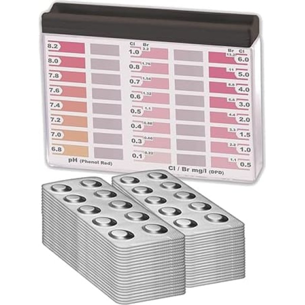 Premium pool tester chlorine pH plus test tablets Rapid Colour Match Shake Tester Tablets Warning: not suitable for photometers Precise method for determining water values: free chlorine and pH content Box contents: 1 x premium water tester with 200 x DPD N°1 and 200 x phenol red measuring tablets MediMuc always from current production. Information on handling and best before date are described pictorially on the left. › See more product details; Product description Product description MediMuc premium water tester with two measuring chambers plus test tablets, displays 16 different readings. Package includes: Water tester with a measuring chamber. 200 x DPD1 measuring tablets. 200 x Phenol Red measuring tablets. Replacement tablets for rapid method (shake tester, colour matching), not suitable for photometers. Recommended water values: ideal pH value 7.0 to 7.6. Ideal chlorine content: 1.0 - 3.0 mg/l. Note: To measure exactly 10 ml, the tester is closed before the tablet is added. The lid squeezes out the excess water. To get an accurate test result, do not touch the tablets with your fingers so that the test result is not distorted. Note: The water tester must be rinsed after each measurement process Directions To measure exactly 10 ml, the tester is closed before the tablet is added. The lid squeezes out the excess water. To get an accurate test result, do not touch the tablets with your fingers so that the test result is not distorted. Rinse the tester after each measurement process.; Product description Product description MediMuc premium water tester with two measuring chambers plus test tablets, displays 16 different readings. Package includes: Water tester with a measuring chamber. 200 x DPD1 measuring tablets. 200 x Phenol Red measuring tablets. Replacement tablets for rapid method (shake tester, colour matching), not suitable for photometers. Recommended water values: ideal pH value 7.0 to 7.6. Ideal chlorine content: 1.0 - 3.0 mg/l. Note: To measure exactly 10 ml, the tester is closed before the tablet is added. The lid squeezes out the excess water. To get an accurate test result, do not touch the tablets with your fingers so that the test result is not distorted. Note: The water tester must be rinsed after each measurement process Directions To measure exactly 10 ml, the tester is closed before the tablet is added. The lid squeezes out the excess water. To get an accurate test result, do not touch the tablets with your fingers so that the test result is not distorted. Rinse the tester after each measurement process.; Product description MediMuc premium water tester with two measuring chambers plus test tablets, displays 16 different readings. Package includes: Water tester with a measuring chamber. 200 x DPD1 measuring tablets. 200 x Phenol Red measuring tablets. Replacement tablets for rapid method (shake tester, colour matching), not suitable for photometers. Recommended water values: ideal pH value 7.0 to 7.6. Ideal chlorine content: 1.0 - 3.0 mg/l. Note: To measure exactly 10 ml, the tester is closed before the tablet is added. The lid squeezes out the excess water. To get an accurate test result, do not touch the tablets with your fingers so that the test result is not distorted. Note: The water tester must be rinsed after each measurement process Directions To measure exactly 10 ml, the tester is closed before the tablet is added. The lid squeezes out the excess water. To get an accurate test result, do not touch the tablets with your fingers so that the test result is not distorted. Rinse the tester after each measurement process.