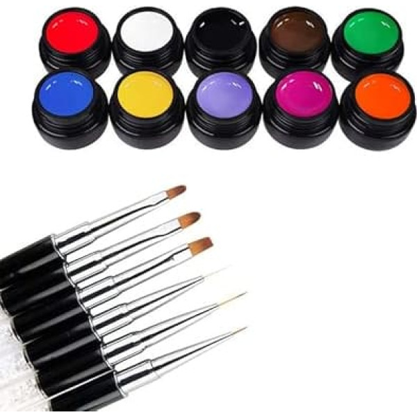 PERFECT MANICURE KIT:11pcs high quality nail polish (8g) with 6 brushes for different uses, the best choice for professional salon beauty salon or personal use at home. Cosmetically safe materials available with safety data sheet. 11 bright beautiful colours that meet all your requirements to achieve a stunning nail design: black, white, red, orange, yellow, green, pink, etc. Need to be cured under UV or LED lamp. This gel nail polish is easy to use for painting, drawing, drawing lines, stripes, etc. with realistic cooling effect. 2-3 weeks high gloss wear, long lasting. Excellent adhesion, thick viscosity, no shrinkage, covers flawlessly even in thin layers. Does not flow, allows you to work precisely on the smallest details of your latest nail art masterpiece. Can also be wonderfully mixed with glitter and/or acrylic to create stunning effects. Easy one-layer application, now highlight your nails, make it special and fashionable › See more product details; Product description Items included: 11 x painting gel (volume: 8 g). 6 x different functions brushes - painting, drawing lines, stripes, flower effect, etc. Functions: 1. Ideal for creating your own beautiful nail art design on finger or toenails. 2. Can be used with other nail art products such as nail polish, UV gel, acrylic, etc. 3. Can be used on both artificial nails and natural nails. 4. The paints can be used on different surfaces such as nails, paper, bricks, wood and other artwork. 5. Suitable for professional or home use. Steps: Step 1. Clean the nails and trim the nail surface as usual. Step 2. Apply the base coat first to make the polish last longer. Cure with UV lamp or LED lamp. Step 3. Use this painted gel to draw any pattern. Then under LED lamp approx. 30 seconds or under a UV lamp for approx. 2 minutes. Step 4. Brush with removable top coat to make the colour more radiant, then cure with UV lamp or LED lamp; Step 5. Remove the sticky surface with cotton soaked in detergent.; Product description Items included: 11 x painting gel (volume: 8 g). 6 x different functions brushes - painting, drawing lines, stripes, flower effect, etc. Functions: 1. Ideal for creating your own beautiful nail art design on finger or toenails. 2. Can be used with other nail art products such as nail polish, UV gel, acrylic, etc. 3. Can be used on both artificial nails and natural nails. 4. The paints can be used on different surfaces such as nails, paper, bricks, wood and other artwork. 5. Suitable for professional or home use. Steps: Step 1. Clean the nails and trim the nail surface as usual. Step 2. Apply the base coat first to make the polish last longer. Cure with UV lamp or LED lamp. Step 3. Use this painted gel to draw any pattern. Then under LED lamp approx. 30 seconds or under a UV lamp for approx. 2 minutes. Step 4. Brush with removable top coat to make the colour more radiant, then cure with UV lamp or LED lamp; Step 5. Remove the sticky surface with cotton soaked in detergent.; Items included: 11 x painting gel (volume: 8 g). 6 x different functions brushes - painting, drawing lines, stripes, flower effect, etc. Functions: 1. Ideal for creating your own beautiful nail art design on finger or toenails. 2. Can be used with other nail art products such as nail polish, UV gel, acrylic, etc. 3. Can be used on both artificial nails and natural nails. 4. The paints can be used on different surfaces such as nails, paper, bricks, wood and other artwork. 5. Suitable for professional or home use. Steps: Step 1. Clean the nails and trim the nail surface as usual. Step 2. Apply the base coat first to make the polish last longer. Cure with UV lamp or LED lamp. Step 3. Use this painted gel to draw any pattern. Then under LED lamp approx. 30 seconds or under a UV lamp for approx. 2 minutes. Step 4. Brush with removable top coat to make the colour more radiant, then cure with UV lamp or LED lamp; Step 5. Remove the sticky surface with cotton soaked in detergent.