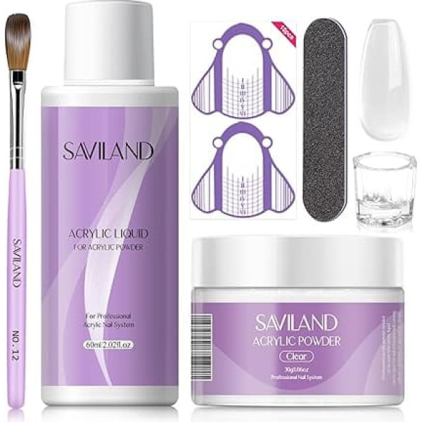 Saviland Acrylic Nail Set: 30 g Clear Acrylic Powder and 60 ml Acrylic Liquid with Acrylic Brush, Nail Stencil, Nail Files, Dappen Dish for Acrylic Nail Extension, Nail DIY Starter Set for Beginners