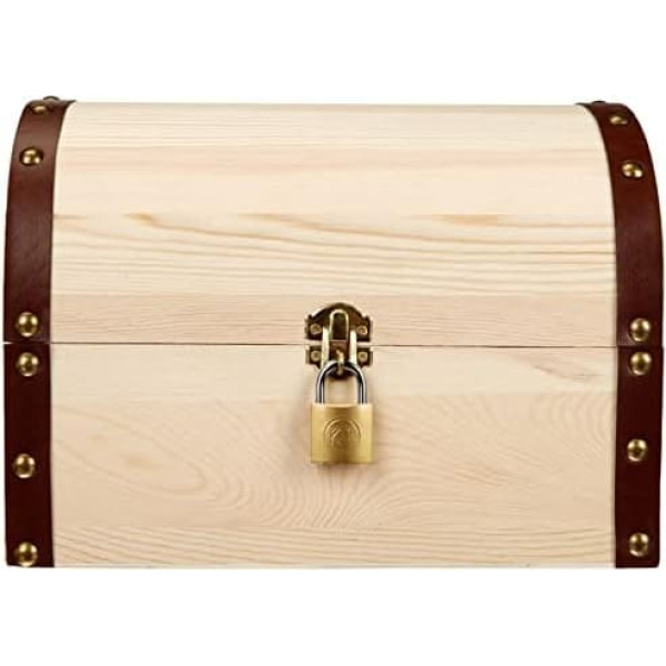 Treasure chest with closure Size: approx. 27 x 18 x 20 cm With security lock and 2 keys Made from natural pine wood, FSC certified Ideal as a jewellery box, for decorative purposes or as a gift › See more product details; Product description Product Description All treasures will find their place in this trendy treasure chest with rounded and closure. The chest is approx. 27 x 18 x 20 cm, is made of pine wood and is FSC certified. The rustic look is rounded off by the rivets and the closure made of metal. Also included is a security lock with 2 keys. If the simple wood grain is too boring, you can let your creativity run wild. Whether decoupage, easy painting, varnishing or gluing, this treasure chest is suitable for anything. Safety Warning Not suitable for children under 36 months Box Contains 1x Holzbox See more; Product description Product Description All treasures will find their place in this trendy treasure chest with rounded and closure. The chest is approx. 27 x 18 x 20 cm, is made of pine wood and is FSC certified. The rustic look is rounded off by the rivets and the closure made of metal. Also included is a security lock with 2 keys. If the simple wood grain is too boring, you can let your creativity run wild. Whether decoupage, easy painting, varnishing or gluing, this treasure chest is suitable for anything. Safety Warning Not suitable for children under 36 months Box Contains 1x Holzbox See more; Product Description All treasures will find their place in this trendy treasure chest with rounded and closure. The chest is approx. 27 x 18 x 20 cm, is made of pine wood and is FSC certified. The rustic look is rounded off by the rivets and the closure made of metal. Also included is a security lock with 2 keys. If the simple wood grain is too boring, you can let your creativity run wild. Whether decoupage, easy painting, varnishing or gluing, this treasure chest is suitable for anything. Safety Warning Not suitable for children under 36 months Box Contains 1x Holzbox See more