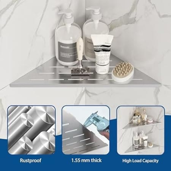 High quality: this corner shower caddy is made of 304 stainless steel, which is rust-proof, scratch-resistant, corrosion-resistant, durable and easy to clean, making it suitable for use in wet bathrooms Durable and sturdy: the stainless steel bathroom shelf features a sturdy and durable hollow construction, which can not only hold up to 10 kg, but also quickly drains and air dry. This makes it the perfect solution for storage and organisation in the bathroom and kitchen. Space Saving The 90° triangle corner shelf is perfect for designing the vertical space in the wall corner to store shampoo and shower gel for a clean and tidy bathroom. Easy Installation The recessed shower shelf stainless steel for tiled walls requires no drilling and can be installed in minutes. Open shelves allow easy access to items and daily cleaning Includes: 2 x 254 x 254 mm stainless steel shower basket and product instructions › See more product details; Product description Includes: 254 x 254 mm stainless steel shower shelf, set of 2 and product instructions (English language not guaranteed). High-quality stainless steel: the shower shelf is made of 304 stainless steel, which is rust-proof, scratch-resistant, corrosion-resistant, durable and easy to clean. Due to its heavy and hollow structure, the frame can not only withstand a weight of 10 kg, but also quickly drain and air dry, making it suitable for storage and organisation solutions in bathrooms and kitchens. Easy to install: the built-in shower shelf without drilling can be easily installed in minutes. Open shower shelf makes it easy to pick up items and clean daily. Space-saving: the shower caddy is specially designed to organise your space and is suitable for wall corners. It requires no drilling and does not damage the wall. Vertical space can be freely designed to store shampoo, shower gel and other bathroom accessories, make the bathroom cleaner and tidier; Product description Includes: 254 x 254 mm stainless steel shower shelf, set of 2 and product instructions (English language not guaranteed). High-quality stainless steel: the shower shelf is made of 304 stainless steel, which is rust-proof, scratch-resistant, corrosion-resistant, durable and easy to clean. Due to its heavy and hollow structure, the frame can not only withstand a weight of 10 kg, but also quickly drain and air dry, making it suitable for storage and organisation solutions in bathrooms and kitchens. Easy to install: the built-in shower shelf without drilling can be easily installed in minutes. Open shower shelf makes it easy to pick up items and clean daily. Space-saving: the shower caddy is specially designed to organise your space and is suitable for wall corners. It requires no drilling and does not damage the wall. Vertical space can be freely designed to store shampoo, shower gel and other bathroom accessories, make the bathroom cleaner and tidier; Includes: 254 x 254 mm stainless steel shower shelf, set of 2 and product instructions (English language not guaranteed). High-quality stainless steel: the shower shelf is made of 304 stainless steel, which is rust-proof, scratch-resistant, corrosion-resistant, durable and easy to clean. Due to its heavy and hollow structure, the frame can not only withstand a weight of 10 kg, but also quickly drain and air dry, making it suitable for storage and organisation solutions in bathrooms and kitchens. Easy to install: the built-in shower shelf without drilling can be easily installed in minutes. Open shower shelf makes it easy to pick up items and clean daily. Space-saving: the shower caddy is specially designed to organise your space and is suitable for wall corners. It requires no drilling and does not damage the wall. Vertical space can be freely designed to store shampoo, shower gel and other bathroom accessories, make the bathroom cleaner and tidier