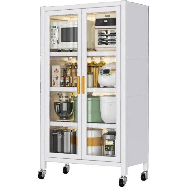 Kitchen Cabinet: Equipped with 4 shelves, this auxiliary cabinet is perfect for organising and storing your kitchen utensils, pantry or cabinet and keeps everything handy and in order. CLEAR DOORS: The elegant clear plastic folding doors allow you to easily see the contents of the cabinet, so you can quickly access your appliances or items and keep the kitchen tidy. 360° WHEELS - Includes 4 360° rotating wheels, 2 of which are equipped with a parking brake and can be exchanged for bolts. They offer an ideal combination of mobility and stability to place your microwave, coffee maker or shelf in any corner of your home. Cable Hole This cabinet features a specially designed opening on the back that facilitates an orderly and discreet installation of cables, ideal for easily connecting your appliances in the living room, kitchen or bathroom. Carbon Steel This carbon steel kitchen sideboard offers exceptional durability and toughness, making it ideal for any room in your home, from the kitchen to the bathroom. › See more product details