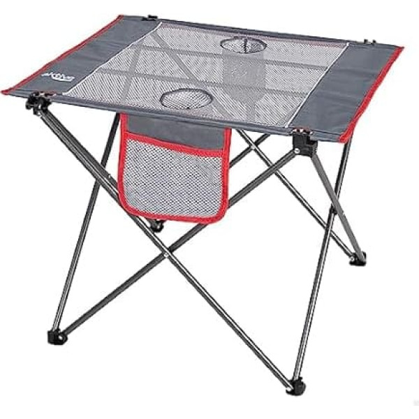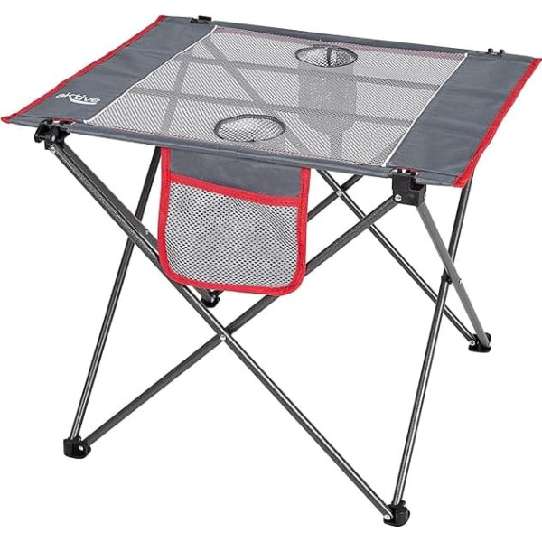 Camping folding table in grey with red active camping details with 2 coasters and side mesh pocket for storing your belongings Dimensions when folded: 12 x 71 cm; Unfolded 62 x 50 x 50 cm; Load capacity: 30 kg Materials: combines 100% polyester fabric with breathable mesh and durable steel frame Safe and stable: with protective legs for added stability and safety on uneven or unstable terrain FOLDABLE & LIGHTWEIGHT: the foldable structure and carry bag with shoulder strap make it easy to carry and store › See more product details